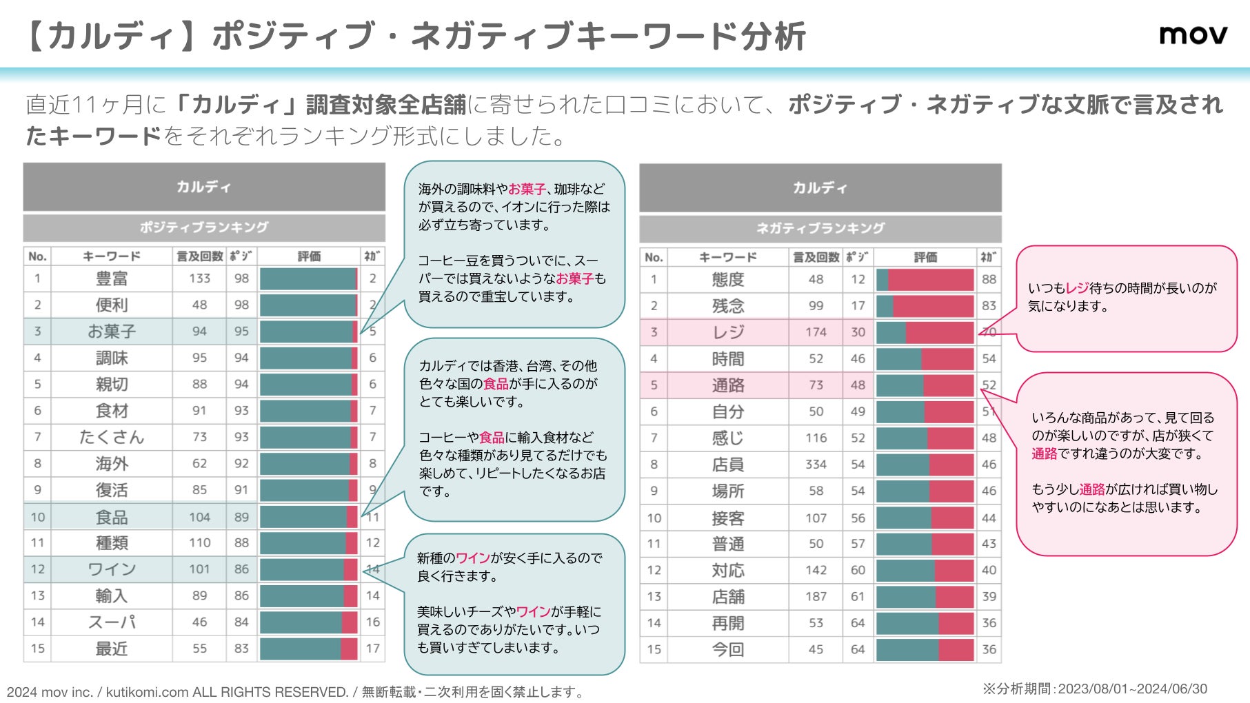ポジティブランキングでは「お菓子」「調味」「食品」「ワイン」といった商品に関するキーワードが、ネガティブランキングでは「通路」「レジ」「態度」など、店内や接客に関するキーワードが多くランクインしています。