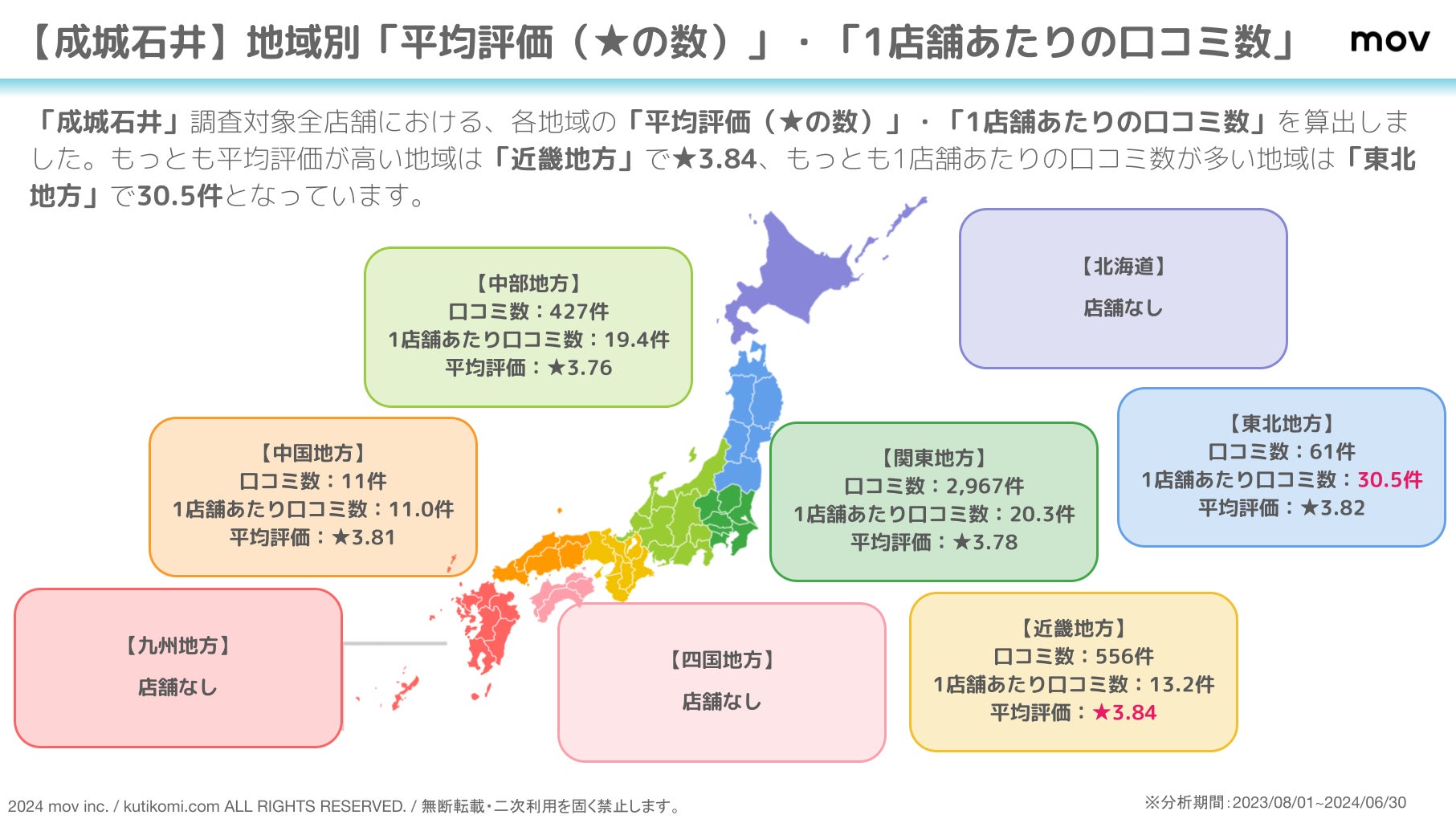 ■ 【成城石井】もっとも平均評価が高い地域は「近畿地方」、もっとも1店舗あたりの口コミ数が多い地域は「東北地方」