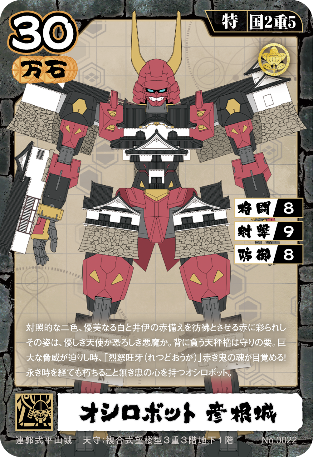 対照的な二色、優美なる白と井伊の赤備えを彷彿とさせる赤に彩られしその姿は、優しき天使か恐ろしき悪魔か。背に負う天秤櫓は守りの要。巨大な脅威が迫りし時、「烈怒旺牙(れつどおうが)」赤き鬼の魂が目覚める!