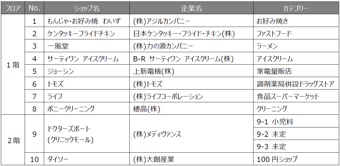 本施設では、 所沢市初進出の食品スーパーマーケット「ライフ」、豊富なおもちゃを取り扱う「キッズランド(おもちゃ売り場)」を併設した家電量販店「ジョーシン」をはじめ、日用必需品をワンストップでお買い物できる便利な店舗が複数出店するほか、様々なシーンでご利用いただける飲食店舗や健やかな生活を支えるクリニックなどが軒を連ね、地域の皆さまの生活に貢献いたします。