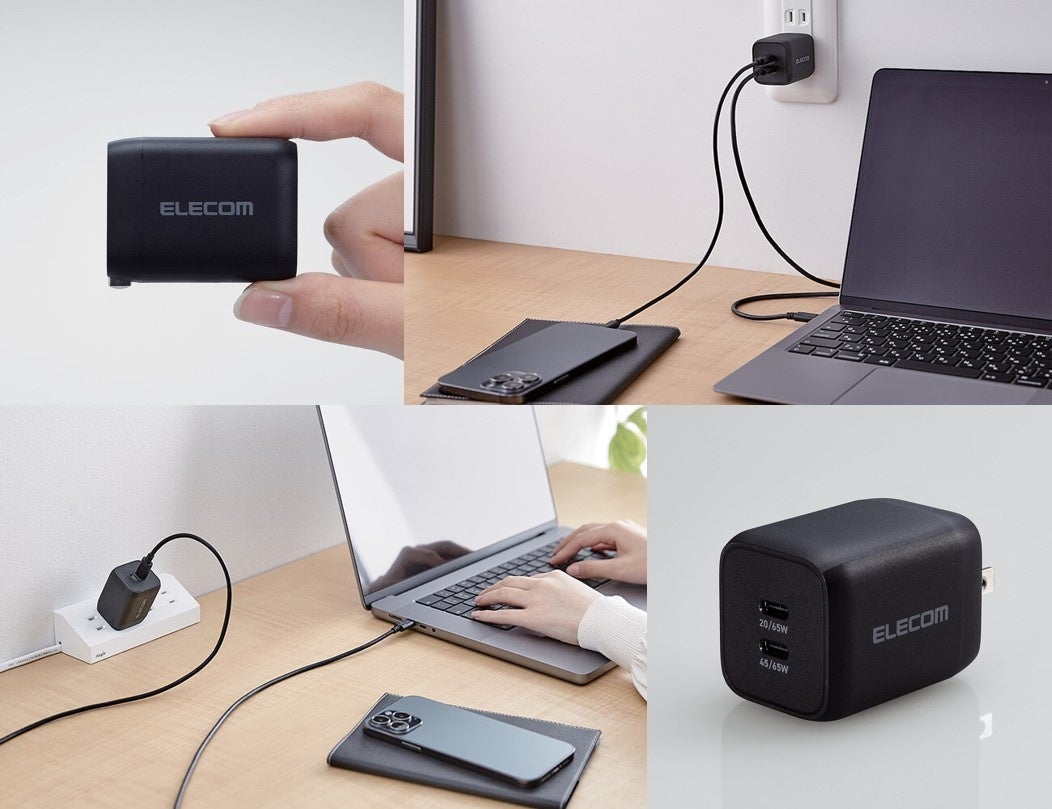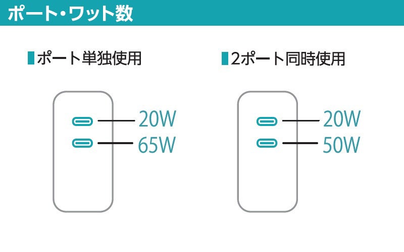 出力端子が2ポートあり、iPhoneなどのスマートフォンとWindowsなどのノートパソコンを2台同時充電できます(2ポート同時出力時は合計最大65W)。