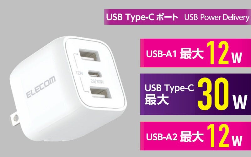 USB Type-C(USB-C)ポートとUSB-Aポートの合計3ポートを搭載し、対応するスマートフォン、タブレット、小型ノートパソコンなどを充電可能なAC充電器です(3ポート同時出力時は合計最大32W)。