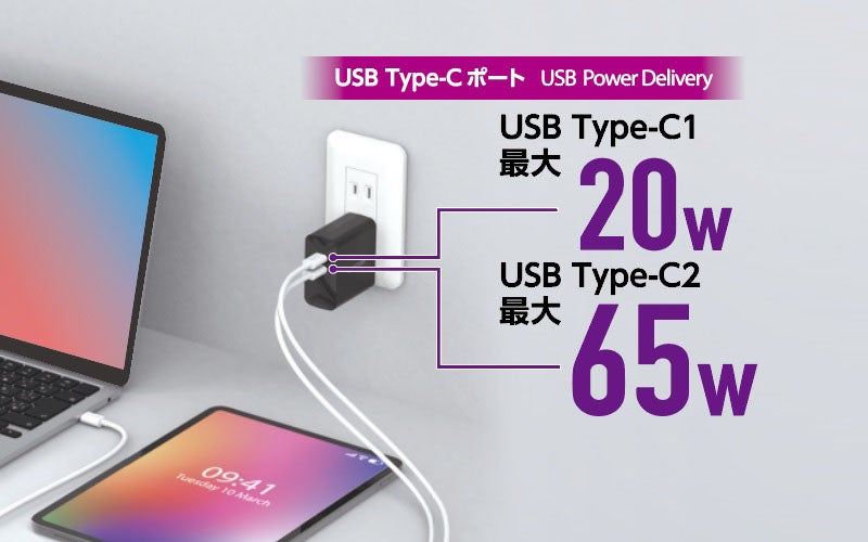 - [MPA-ACCP4570BK・ACDC-PD4570BK]USB Type-C(USB-C)×2ポート・合計最大出力70W