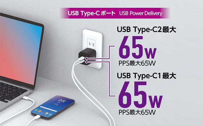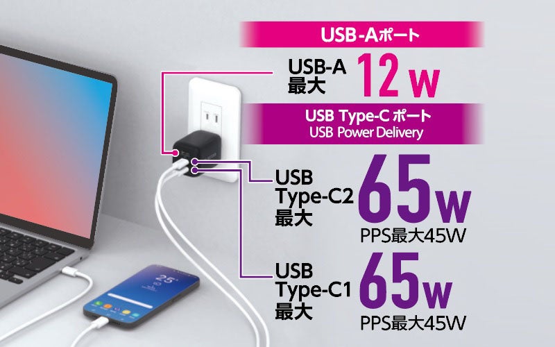 USB Type-C(USB-C)ポートを単独使用することで、小型ノートパソコンの充電だけでなく、65Wクラスのより消費電力の大きな高性能ノートパソコンを充電できたり、0.2V単位で出力を調整することで効率の良い充電が可能な“PPS(Programmable Power Supply)”に対応するモデルもラインアップしています。また、USB-Aポート搭載モデルでは「おまかせ充電」により、端末ごとに最適な出力数で充電します。