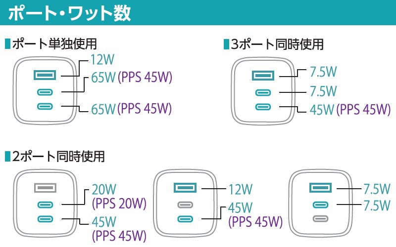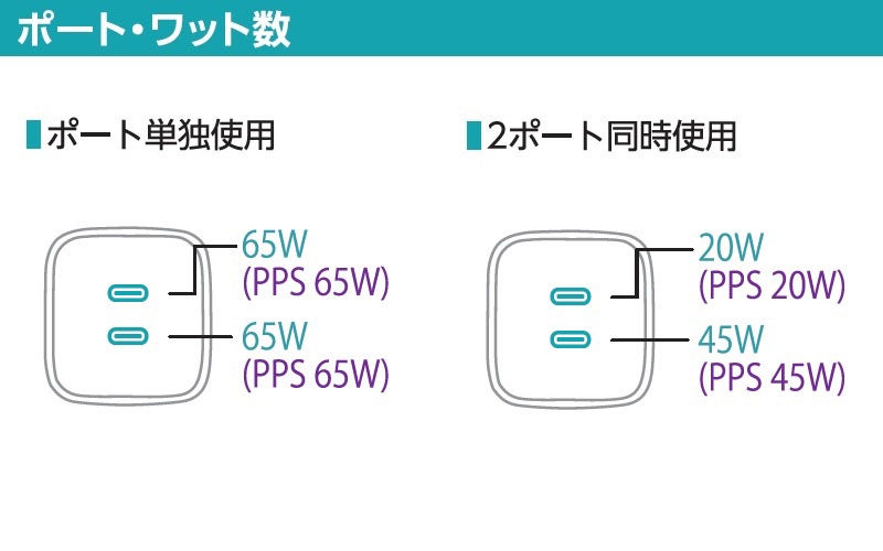 本製品のUSB Power Delivery最大出力は65Wです。PPS最大出力は45Wです。