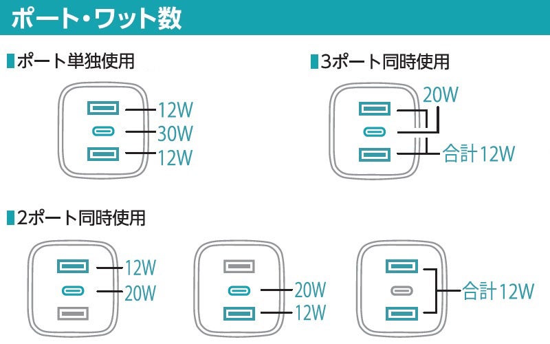 USB Type-C(USB-C)ポート単独使用時、機器に応じて出力が5V/3A、9V/3A、12V/2.5A、15V/2Aと可変し、iPhoneなどのスマートフォンから、iPadなどのタブレット、MacBook Airなどの小型ノートパソコンまで幅広く充電できます。