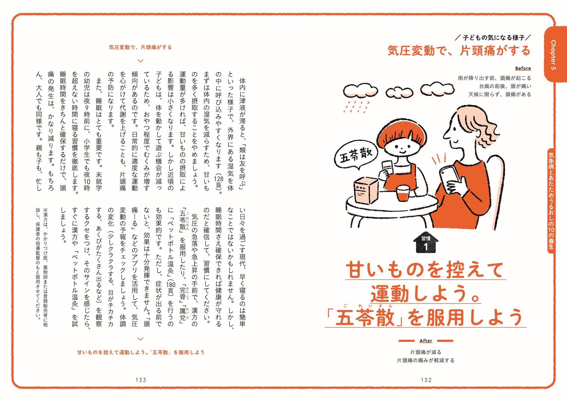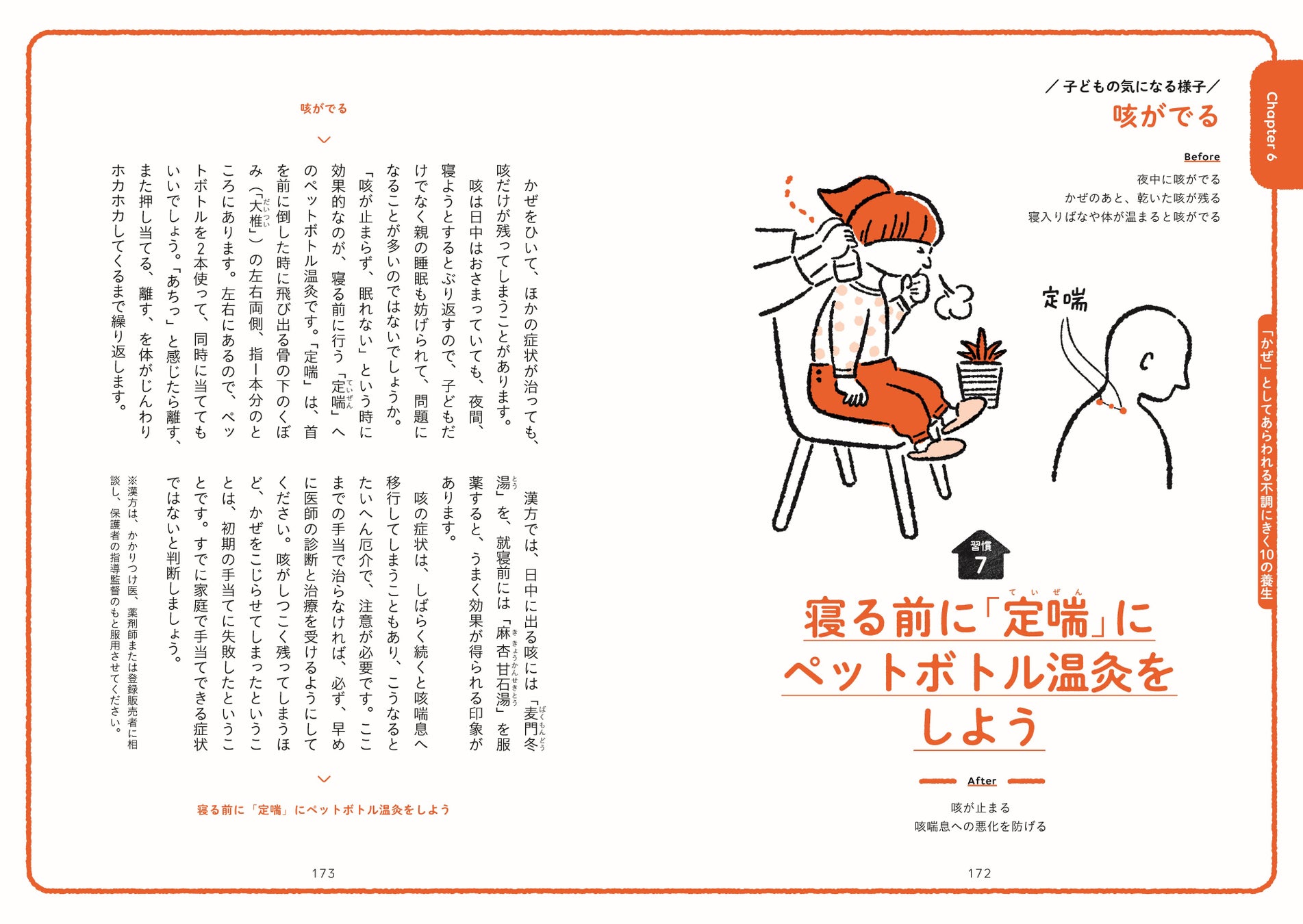 著者考案の「ペットボトル温灸」「つまようじ鍼」「ピーズテーピング」や、親子で服用できる漢方薬を使って、小さな不調を家庭でケア。「かぜのひきはじめ」や「気象病」にも効く手当てを紹介しています。