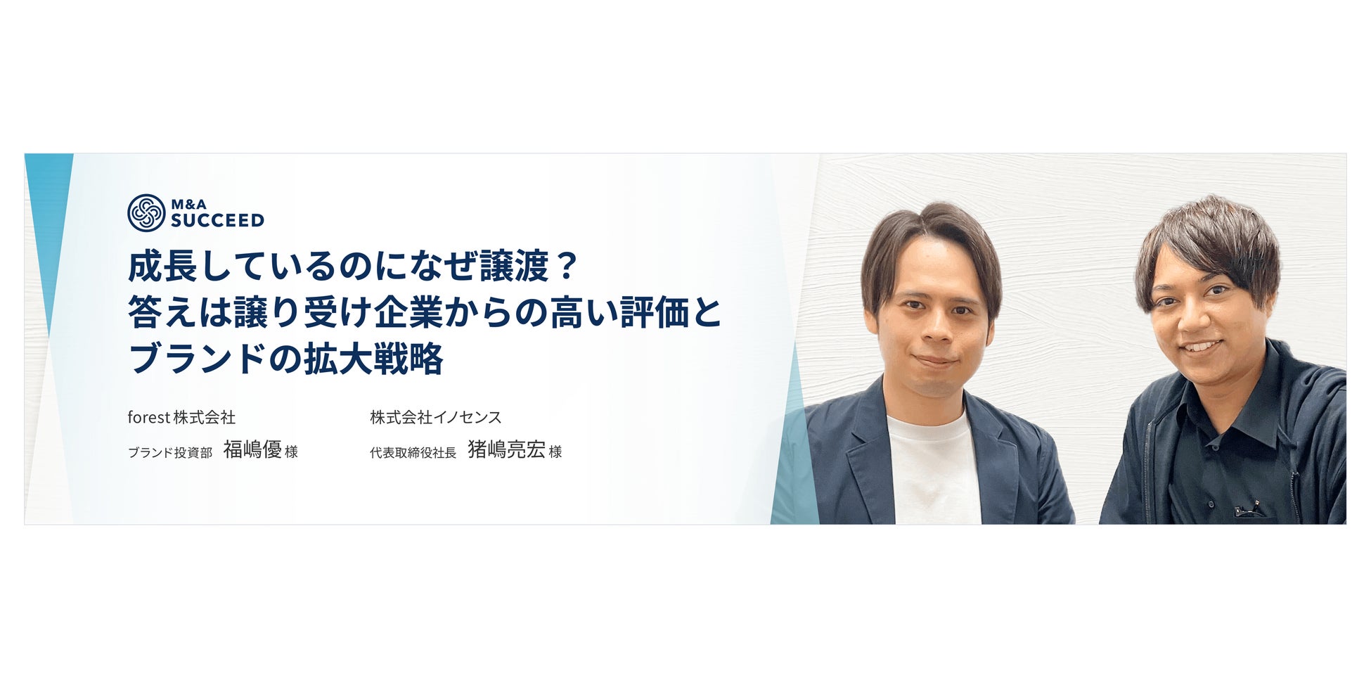 Visionalグループの株式会社M&Aサクシード(所在地:東京都渋谷区/代表取締役社長:金 蓮実)が運営する法人・審査制M&Aマッチングサイト「M&Aサクシード」(https://ma-succeed.jp/)は、「M&Aサクシード」経由で、forest株式会社(所在地:東京都、以下forest)が、株式会社イノセンス(所在地:愛知県、以下イノセンス)を譲り受けたことをお知らせします。そこで本日、二社の対談を公開しました。