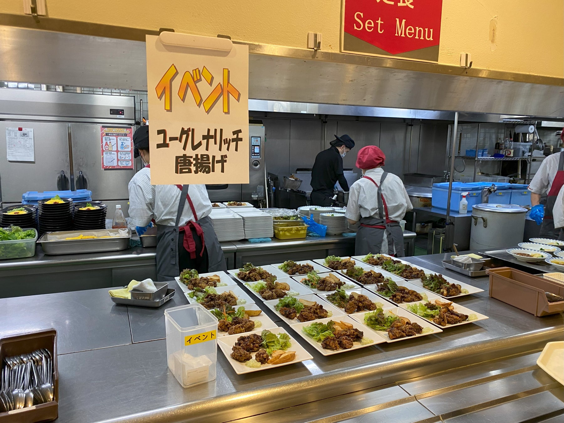 そこでこの度、より多くのお客様に召し上がっていただけるよう 、石垣島ユーグレナを使用したメニューの第 2 弾として、「ユーグレナリッチ唐揚げ」を、SCF が受託運営する全国約400店舗以上(約2万食)の企業・学校の食堂で提供しました。