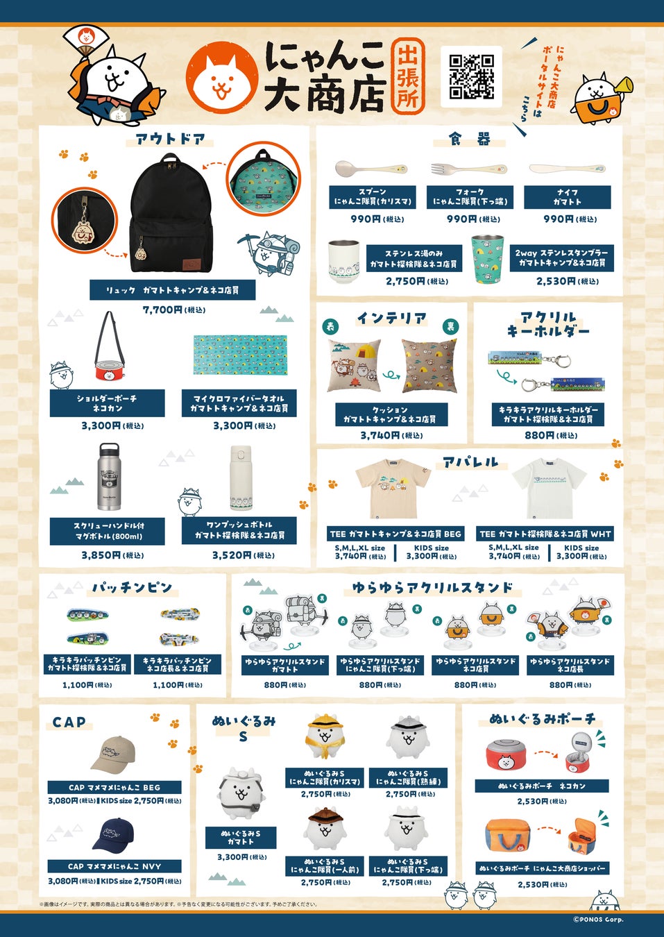 新商品として、人気のガマトト探検隊のぬいぐるみや、ネコ店長のゆらゆらアクリルスタンド、ネコカンぬいぐるみポーチ、ガマトト探検隊&ネコ店員のビジュアルを使用したアウトドアグッズなど、50種類以上のラインナップを予定しております。