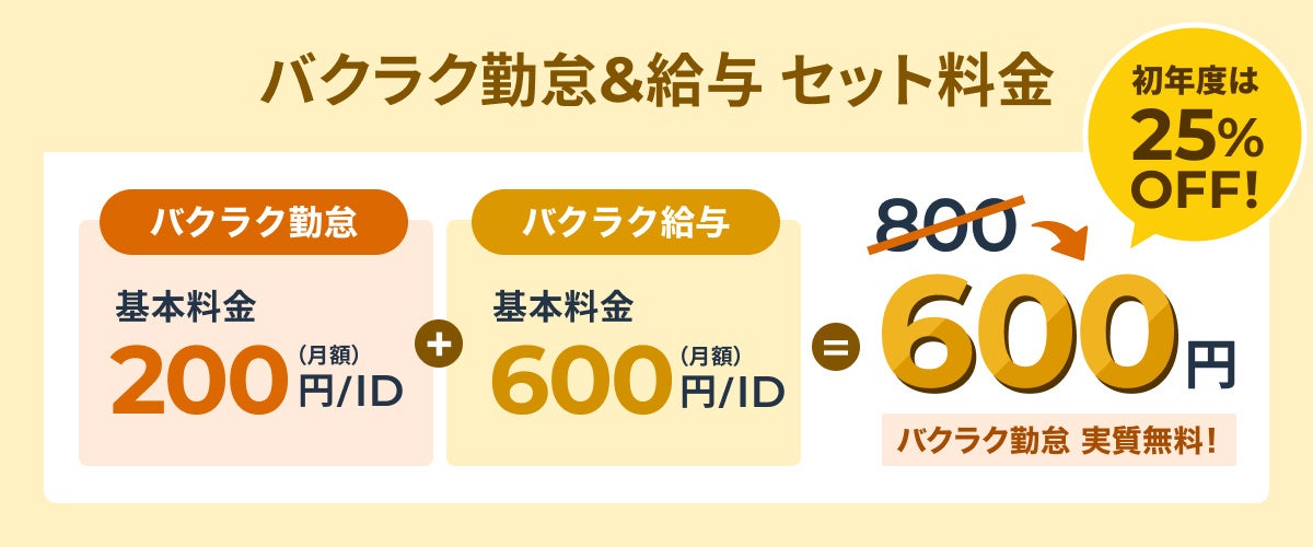 バクラク勤怠とバクラク給与をセットでご契約いただいた場合、初年度の費用を25%割引します。