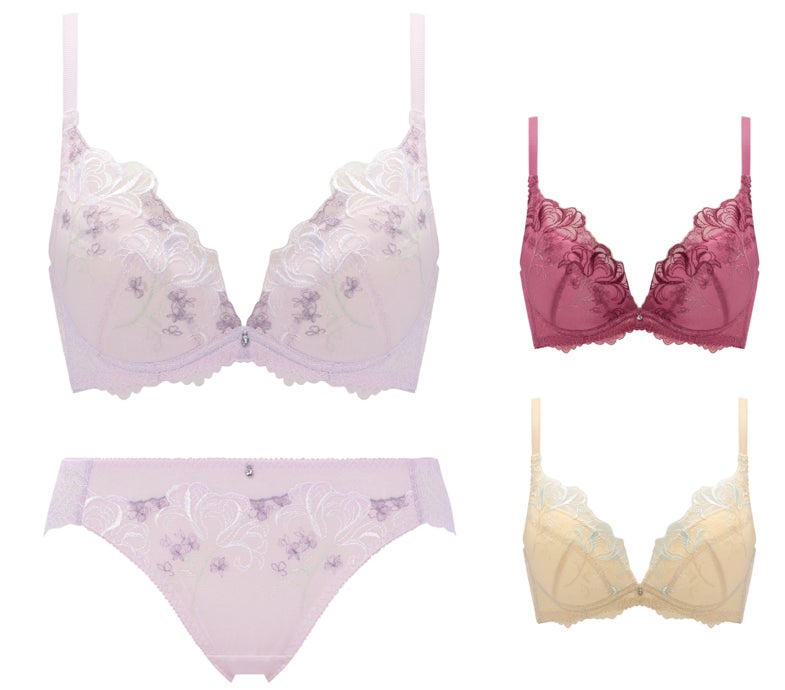 冬に咲く凛とした美しいウィンターリリーを表現したデザインが登場します。DeepVの胸元を可憐なリリー柄のレースが彩り、センターのラインストーンモチーフがアクセントに。ホリデーシーズンにぴったりなボルドーやシャンパンをイメージしたシックなカラーリングと、白いリリーが浮き立つパステルの世界観が幻想的なラベンダーカラーの3色展開です。
