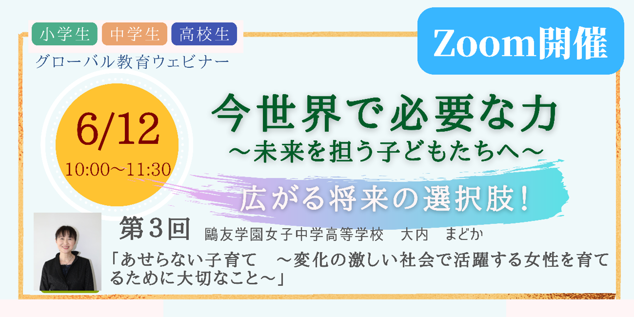 第3回は、鷗友学園女子中学高等学校の大内まどか氏を講師に迎え、2022年6月12日(日)10:00~11:30に開催します。社会でリーダーとなり活躍する力を養うことを目的としたカリキュラムを実践している同校が、「思春期とグローバル教育・個性指導」について講演します。