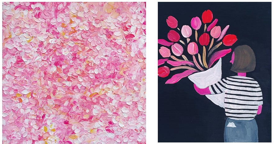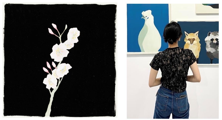 現在は力強い凛とした印象の花の絵を好んで描いており、コロナ禍を経て今のタッチの絵になりました。桜のシーズンの夜桜は私は好きです。いつもの帰り道、春先に咲く桜は東京ならではだと思ってます。実際忙しい毎日なのでここ数年は桜は夜しか見ていません。一生懸命働いた日、友達と呑んだ帰り、いつも通り晩御飯の買い出しをした帰り、街頭に照らされた夜桜がとっても好きです。