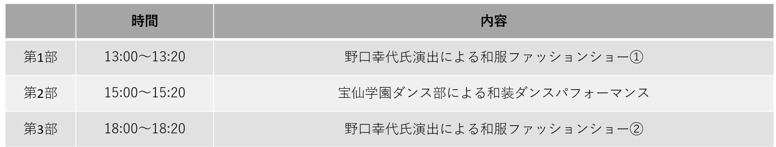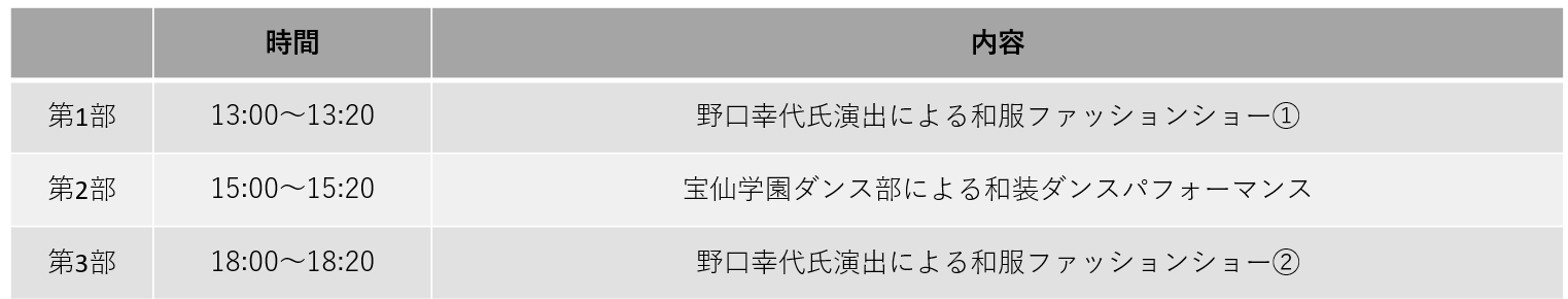 日本橋の情緒あふれる仲通りを“桜”ד和服”をテーマにしたステージで彩ります。ミス・グランド・ジャパン(MGJ)2019公式トレーナーの野口幸代氏が演出を手掛けるファッションショーや世界の大会でも活躍する宝仙学園ダンス部による和装ダンスパフォーマンスショーを開催し、お花見気分を盛り上げます。