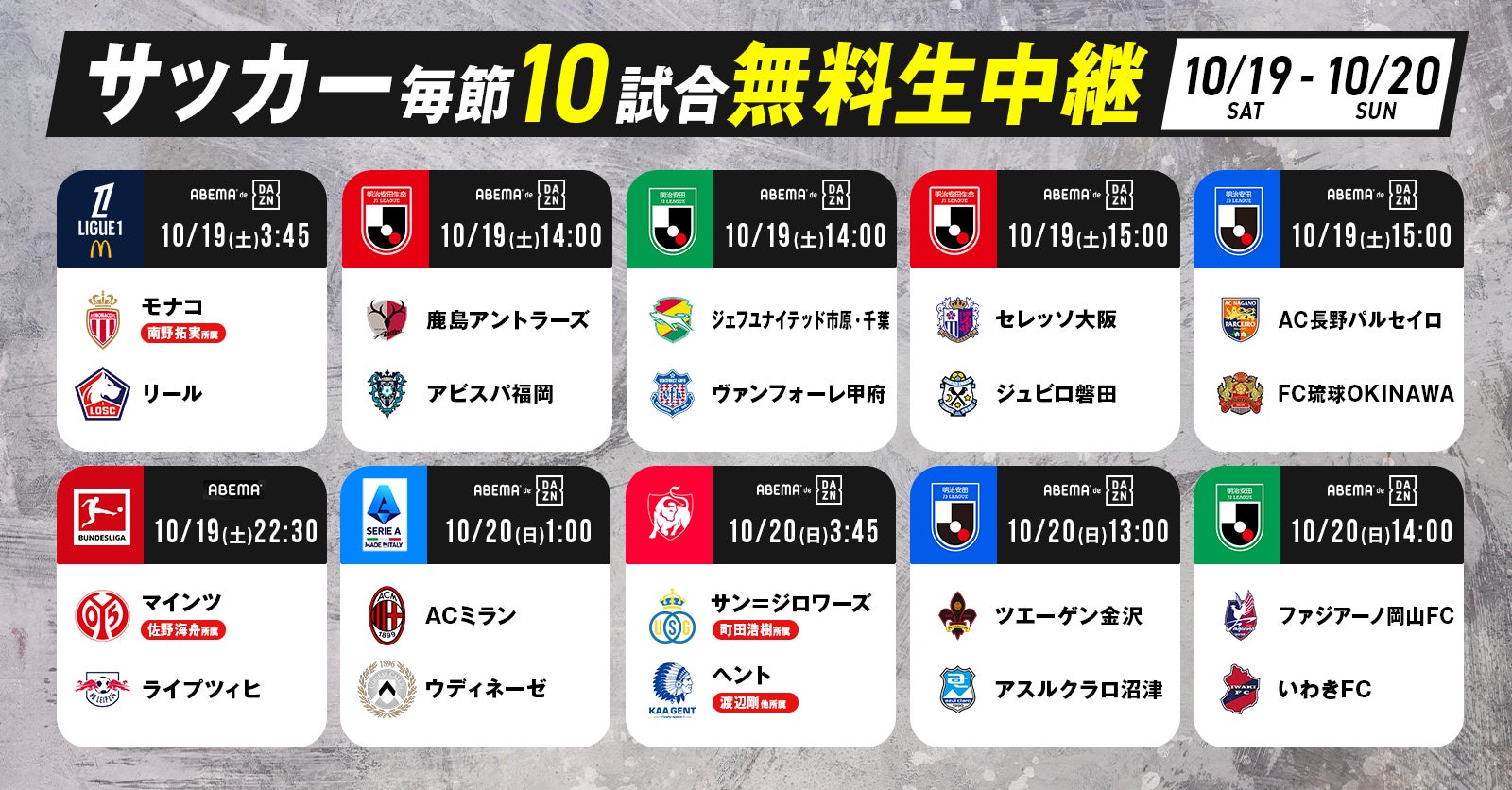 新しい未来のテレビ「ABEMA(アベマ)」では、2024年10月19日(土)~10月20日(日)にて、ドイツのブンデスリーガやフランスのリーグ・アンなどの主要な欧州サッカーリーグや明治安田Jリーグなどの無料生中継する毎節10試合を公開したことをお知らせします。