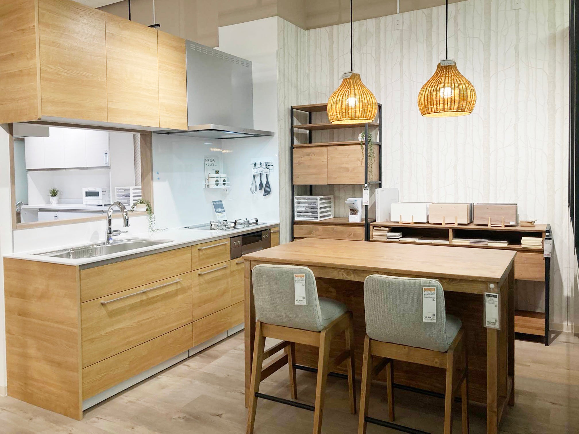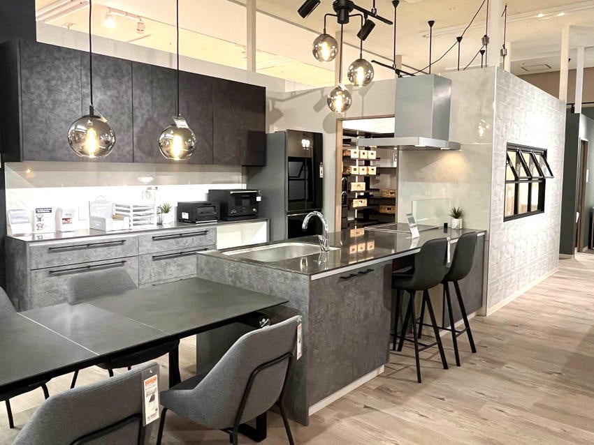 リフォーム商品では、居住空間の商材の展示を拡充しました。システムバスやニトリオリジナルのシステムキッチンなどのリフォーム商材と、ニトリの家具・ホームファッション商品を組み合わせた部屋型プレゼンテーションをご覧いただけます。ニトリならではの「トータルコーディネート」と、「お、ねだん以上。」を感じていただけるご提案となっています。