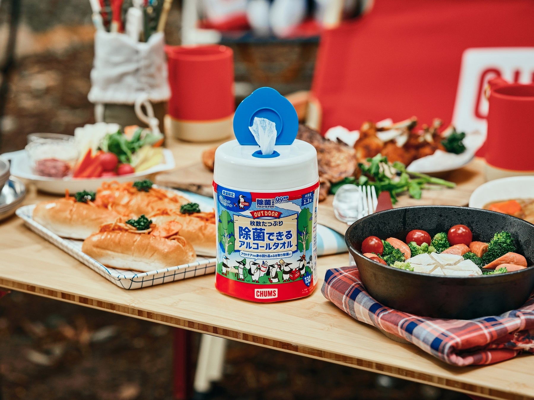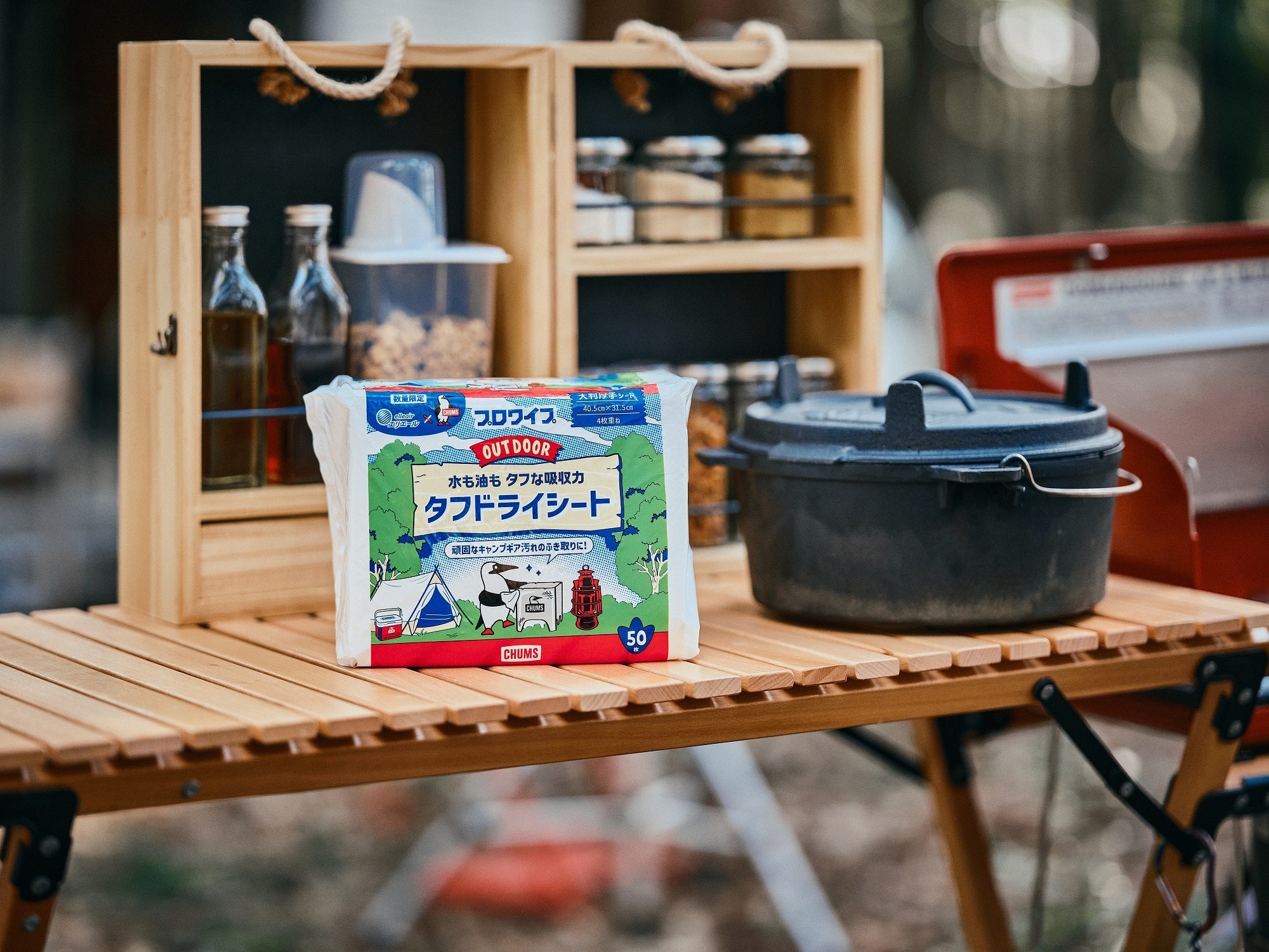 エリエール×チャムス「コラボプロジェクト企画品」は、洗う手間が軽減できて片付けが楽になるような『食器ふきウエットシート』をはじめ、親子で使える『全身シャワー気分シート』など、アウトドアシーンで活躍する5商品をラインナップしました。当社がファミリー層を対象にした調査※3では、アウトドアに持っていく日用品として1位「ウエットティシュー」53.2%、2位「キッチンペーパー」50.1%があげられたことを受け、アウトドア向けに大人数でも気兼ねなく使用できるボトルタイプの『除菌できるアルコールタオル』や、頑固な汚れの拭き取りや食材の水切りなどマルチに使用できる『ドライシート』もご用意しました。また、本シリーズを購入すると、アウトドアを満喫できるチャムスグッズが抽選で合計500名さまに当たるキャンペーンを4月15日(月)から実施します。