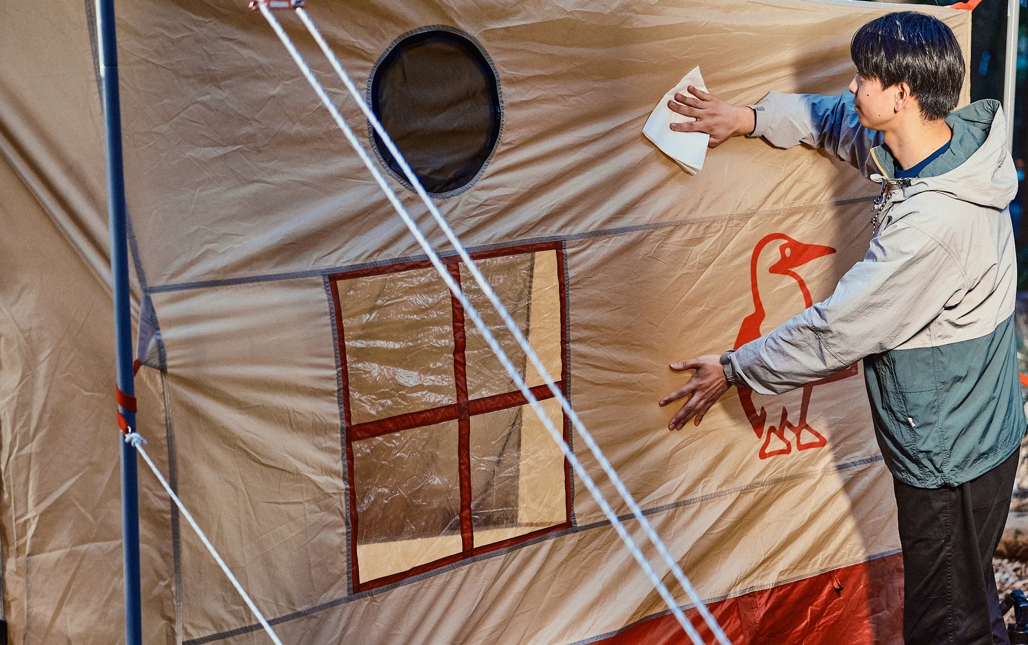 ◎「ブービーバード」がアウトドアでキャンプギアの汚れを拭いている姿を描いたオリジナルデザイン。