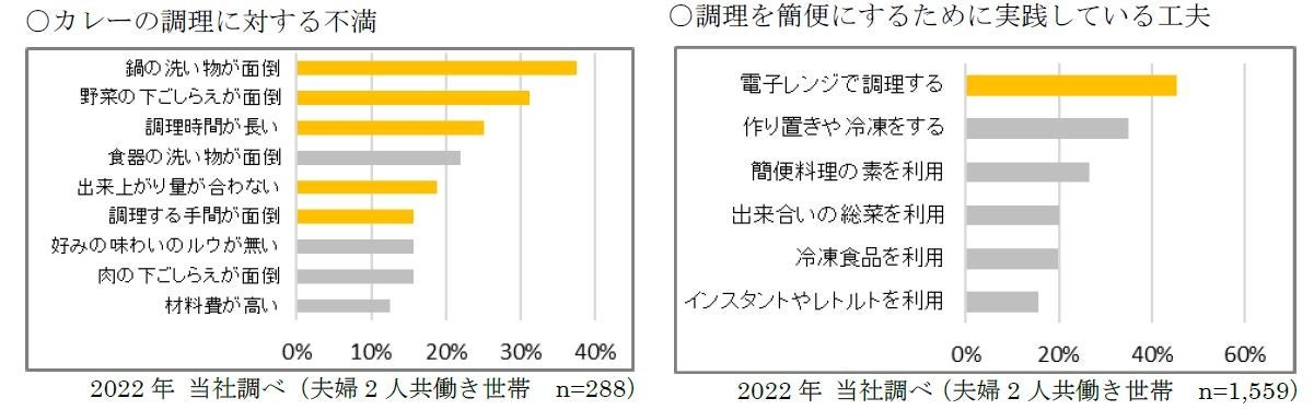 今後増加が想定される2人世帯では、カレー調理において「鍋の洗い物が面倒」「調理時間が長い」などの潜在的な不満や不便さが発生しています。また、簡便調理を行うために実践している工夫として、「電子レンジ調理」が多い傾向にあります。