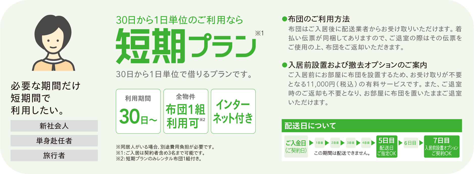 これまでの短期プランでは最短30日、最長100日の契約期間となっておりましたが、今回のリニューアルでは最長180日へ延長致しました。1日単位での細かく利用できるため、お客様のご利用条件に合った日数でご利用いただけます。