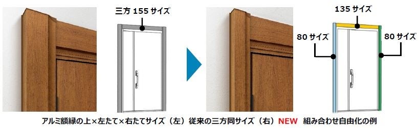 「ドアリモ」は、今あるドア枠に新しい枠をかぶせるカバー工法を採用していますが、既設枠をカバーする「アルミ額縁」は、これまでは上枠と左右のたて枠の三方が同サイズの設定でした。そのため、既設枠の1か所でも見付サイズが大きいと三方全てが大きなサイズとなってしまい、リフォーム前後で意匠感に違いが生じていました。施工面においても、入隅部や軒天に近い場合、額縁の余分な見付け部分を現場でカットする必要があり、施工の手間が発生していました。今回のリニューアルでは、既設ドアの納まり状況に合わせ、アルミ額縁の上×左たて×右たてのサイズをそれぞれ自由に組み合わせができるようにします。これにより、既設枠に合わせたサイズ形状が選択でき、意匠性が向上します。そして、現場でのカットする作業が不要になるため、施工時間の短縮にもつながります。