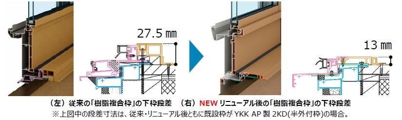 従来のアルミ樹脂複合枠は、施工後の下枠段差が27.5㎜発生していました。今回、枠形状の見直しを行うことで、下枠段差を従来の半分以下に抑制。樹脂複合枠では、従来品の半分以下の段差寸法へ縮小させました。さらに、アルミ枠の場合は、既設枠の形状によっては、ほぼ段差なく納められるようになります。