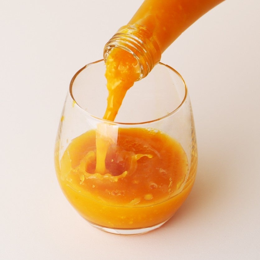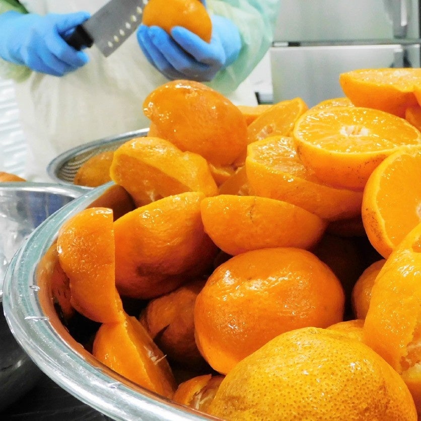 2種類のみかんはそれぞれの特徴が活きるように、種類ごとに果肉のダイスカットの方法を変えています。みかんの大トロと呼ばれる「せとか」はジューシーな果肉が楽しめるよう、皮をむいてそのまま約6mmにダイスカットに。一方、香り高い「温州みかん」は皮に爽やかな香り成分「リモネン」が含まれているので、皮付きのまま粗くおろしました。さらに果肉感が残るよう、低速・低温でフルーツを圧搾することで、もぐもぐ噛めるほどの大きな果肉がたっぷりと詰まったお酒に仕上がりました。
