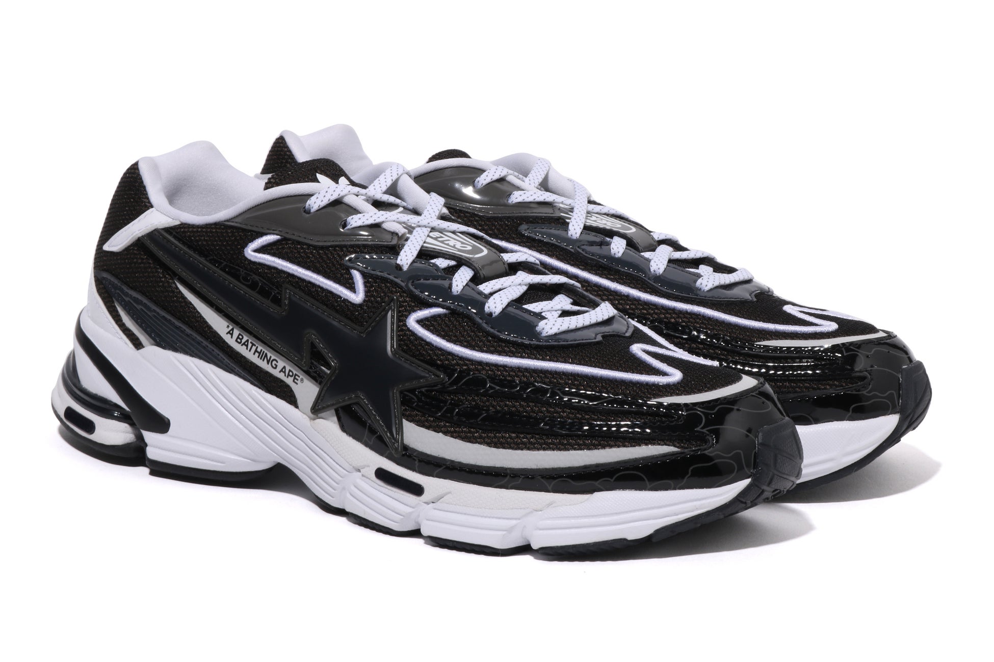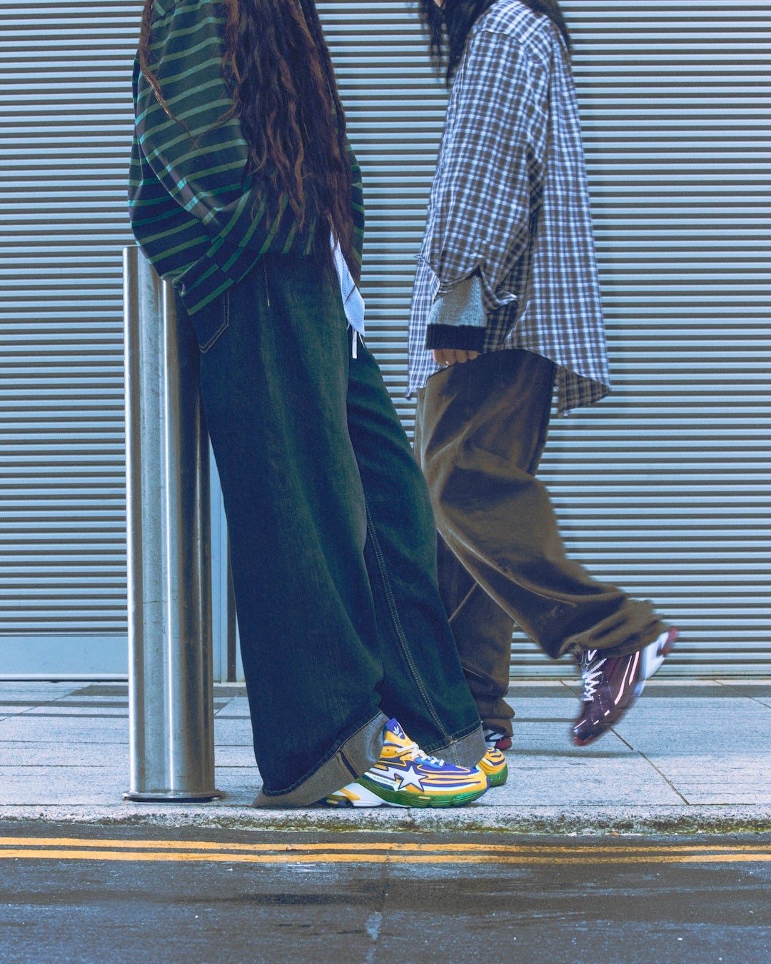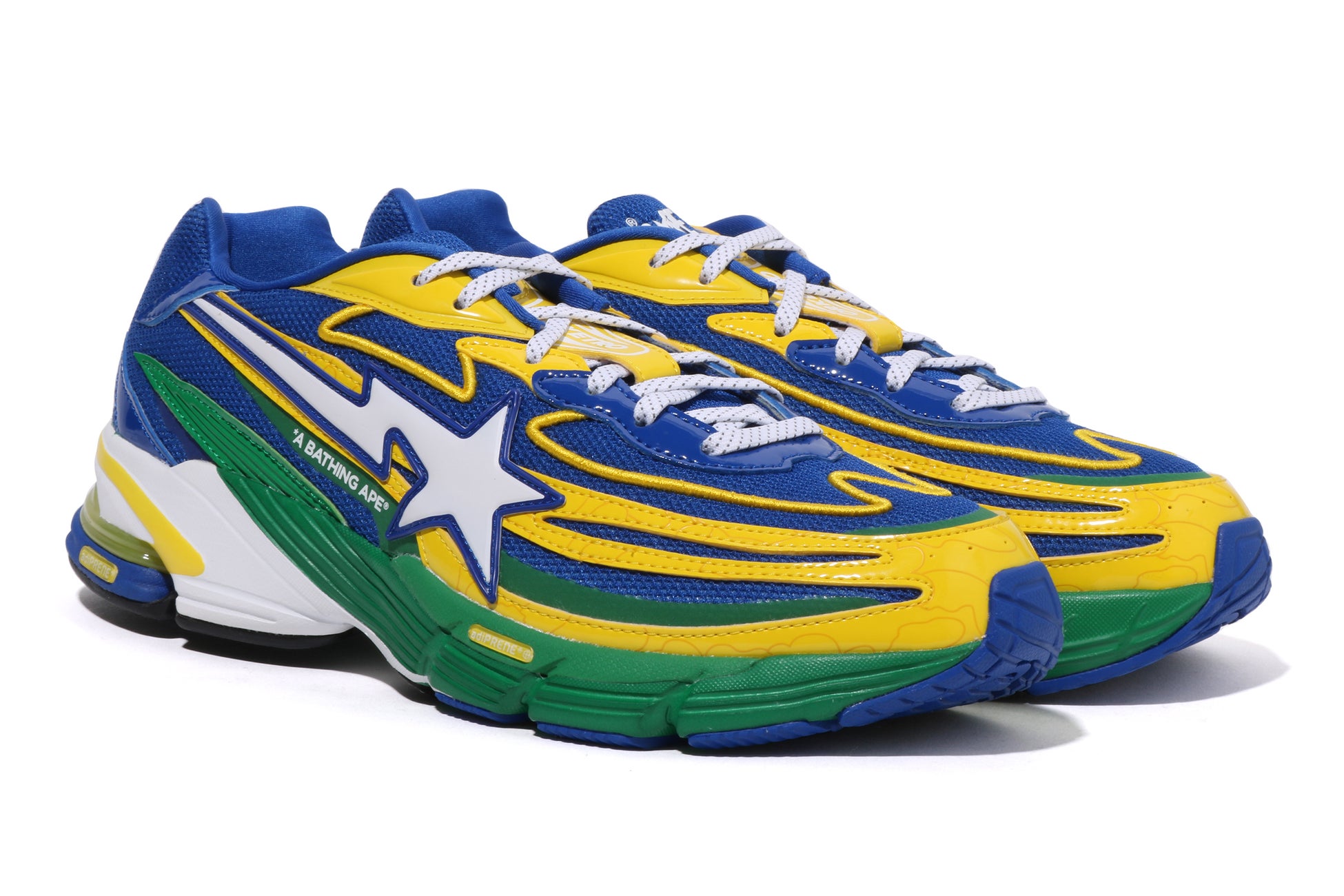 メッシュとエナメルレザーを組み合わせ、オーバーレイはBAPE®︎ CAMOのオリジナルパターンである1ST CAMOでアレンジしています。両サイドに、両ブランドのシグネチャーである“STA”と“スリーストライプス”を配置して、アシンメトリーなデザインに仕上げました。