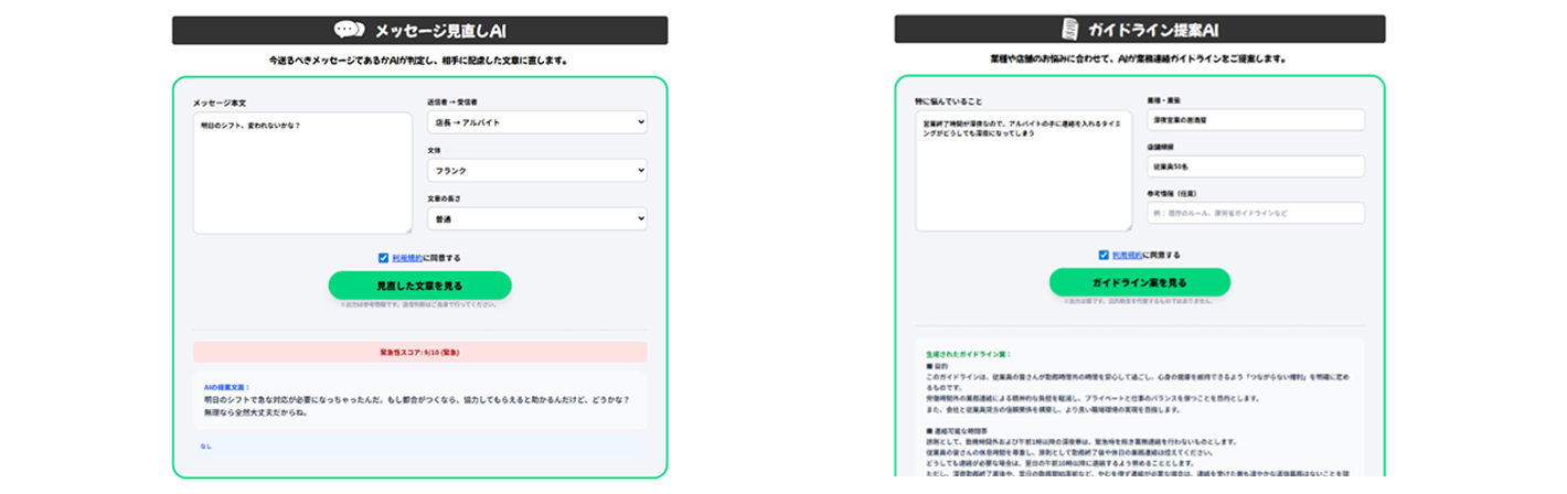 店舗管理者・アルバイト従業員双方が利用可能です。送信者の立場を選択し、伝えたいメッセージ内容を入力するだけで、AIが相手への配慮とビジネスマナーを兼ね備えた適切な文章を生成します。