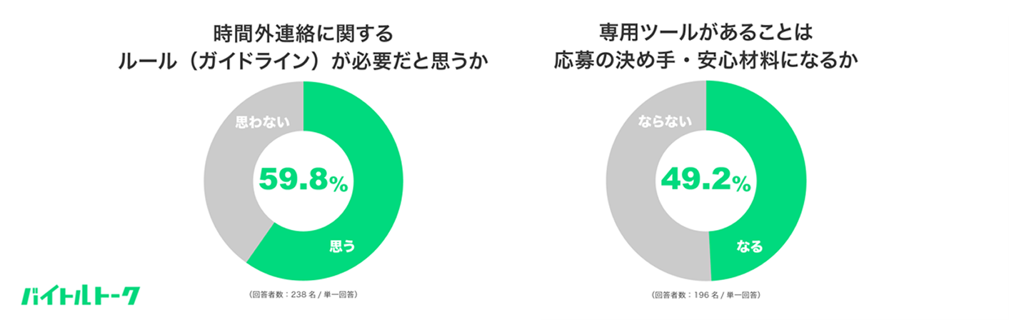 調査の結果、アルバイト従業員の59.8%が時間外連絡に関するルールの必要性を実感していることが判明しました。また、私用SNSを使用しない専用ツールの導入については、49.2%が「応募の決め手や安心材料になる」と回答しています。