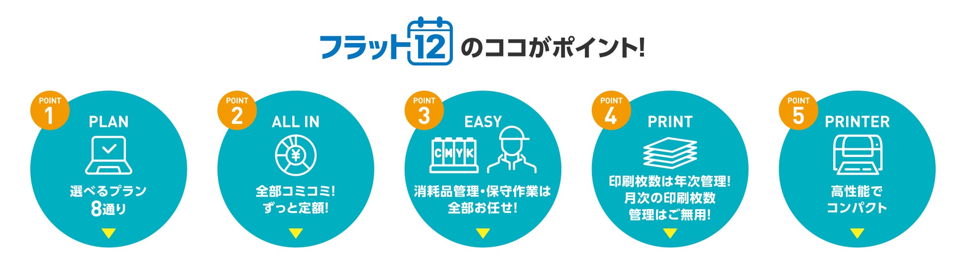 「フラット12」は、プリンターの利用だけでなく、設置や搬入にかかる費用も月額料金に含まれるため、導入時の初期費用を抑えることができる。顧客は用途・印刷枚数にあわせて機種・料金プランを選択できる。年間で印刷枚数の上限を設定しているため、月ごとの使用頻度にバラつきがあっても毎月定額で利用できる。インクやトナーといった消耗品は、残量に応じて自動で手配されるため、顧客は消耗品を管理・発注する手間が省ける。さらに月額料金には、利用中にトラブルが発生した際のサポート費用も含まれる。