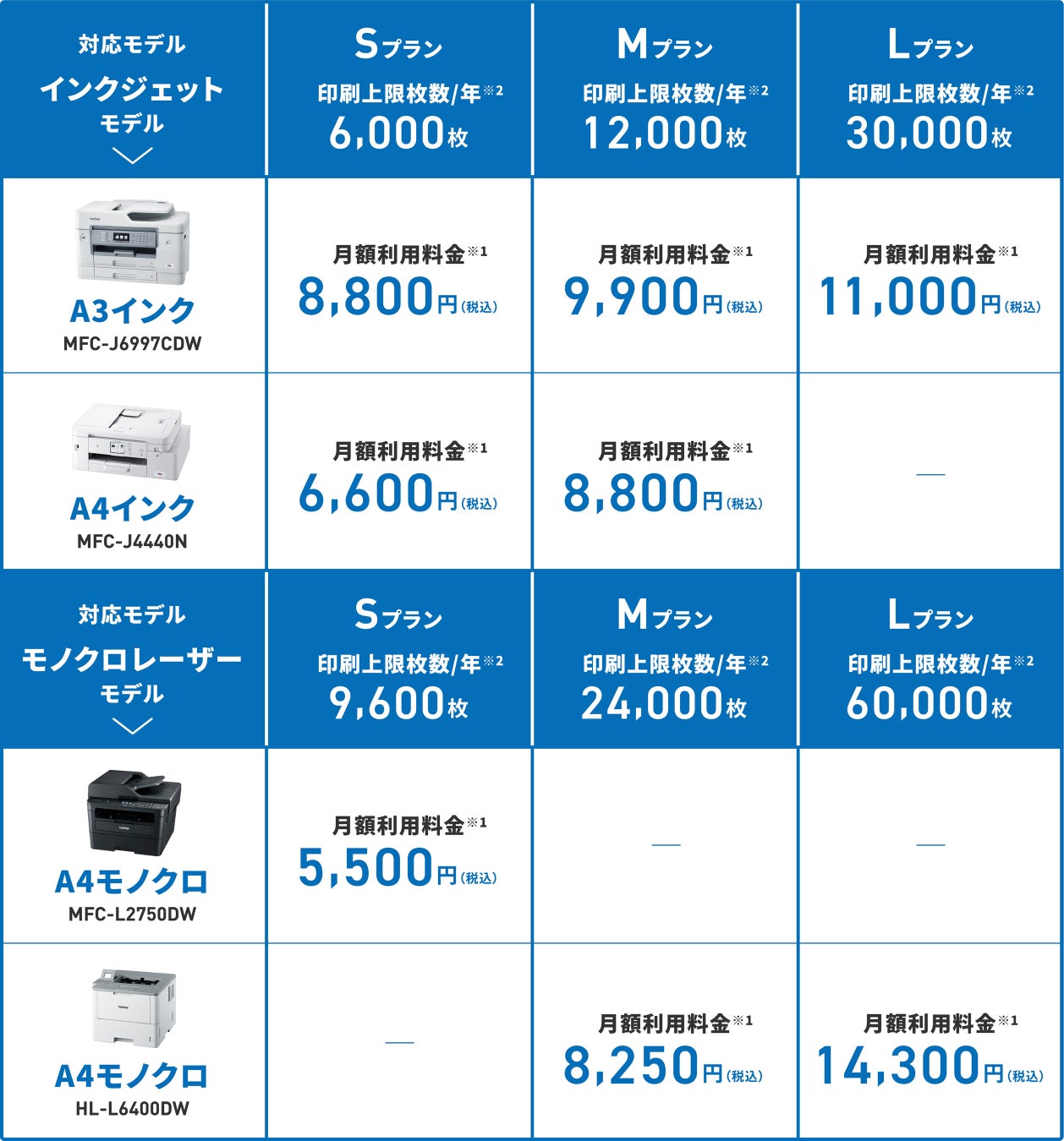 ※2:印刷上限枚数を超過した場合、超過した枚数[1枚×5円] で追加料金が発生します。 カラーインクジェットモデルはモノクロ・カラー印刷共に超過枚数あたりの追加料金は同じです。
