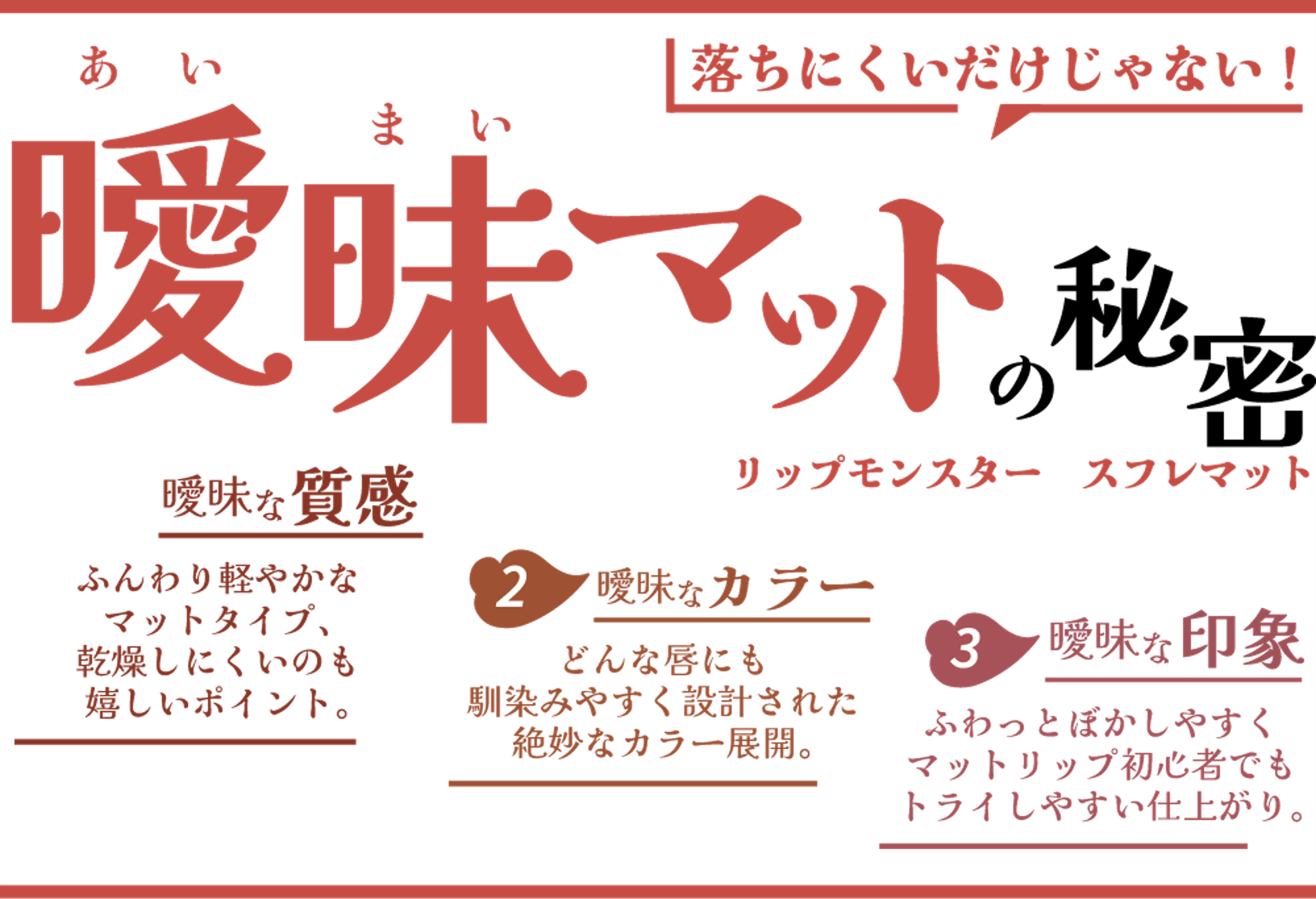 KATE「リップモンスター スフレマット」よりスモーキーなくすみカラーが登場!じんわりぼかせる軽やか”曖昧マット”。長時間乾燥しにくく、つけたての色がそのまま持続。