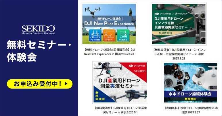 日本初のDJI正規販売代理店である株式会社セキド(本社:東京都港区、代表取締役:⼤下貴之)では、株式会社プロクルー(本社:滋賀県長浜市、代表取締役:松本茂之)と共同で、2023年8月29日(火)14時より滋賀県長浜市にて、産業向け業務用ドローンを使った測量業務に特化した無料実演会「DJI産業用ドローン 測量実演セミナー」を開催いたします。DJI(ディージェーアイ)の最新産業用フラッグシップドローン「MATRICE 350 RTK(マトリス 350 アールティーケー、以下 M350 RTK)」と対応カメラモジュール「Zenmuse(ゼンミューズ) P1」LiDARモジュール「Zenmuse L1」、小型写真測量用ドローン「MAVIC 3 ENTERPRISE(マビック 3 エンタープライズ)」の性能が確認できる、測量現場を模したデモフライトを行い、取得したデータもご確認いただけます。補助金・助成金を活用した導入事例についてもご紹介する、導入検討中の事業者に最適なイベントですので、ぜひこの機会にご参加ください。