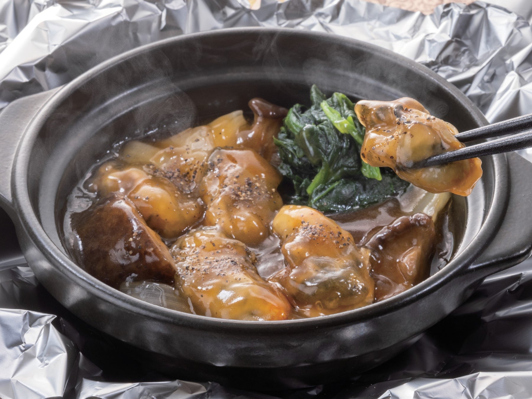 揚げた牡蠣をオイスターベースの餡で煮込んで旨味を出しました。ホイルを開けた時に広がる香りと湯気もお楽しみください。