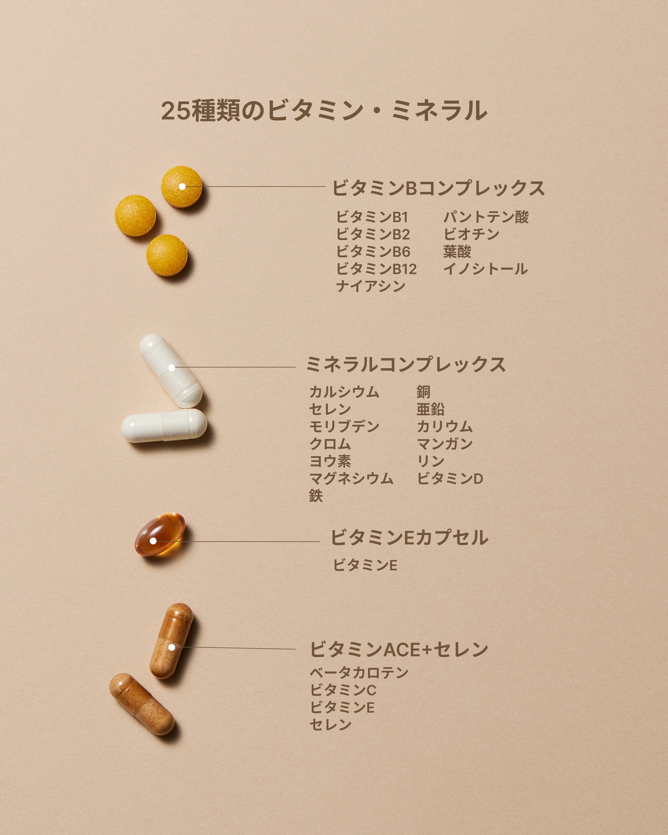 配合成分(全25種): ビタミンB1、ビタミンB2、ビタミンB6、ビタミンB12、ビタミンC、ナイアシン、葉酸、パントテン酸、ビオチン、ビタミンE、ビタミンD、亜鉛、銅、セレン、マンガン、クロム、鉄、カルシウム、マグネシウム、モリブデン、カリウム、リン、ヨウ素、βカロテン、イノシトール