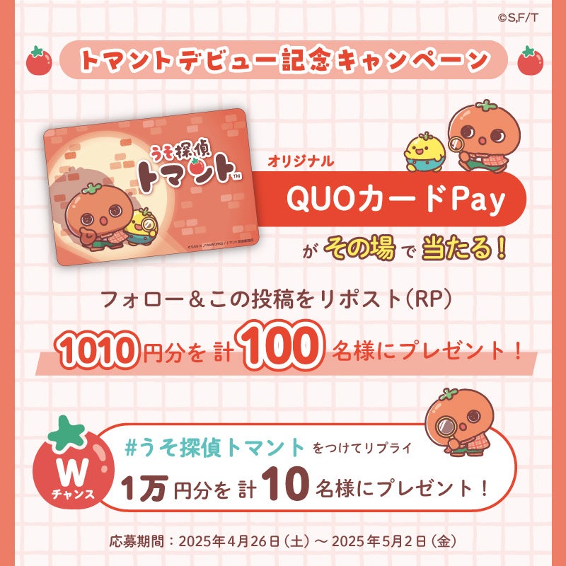 4月26日(土)~5月2日(金) まで、「トマントデビュー記念キャンペーン」の投稿をリポスト(RP)で、オリジナルクオカードPay1010円分を計100名様にプレゼントします。