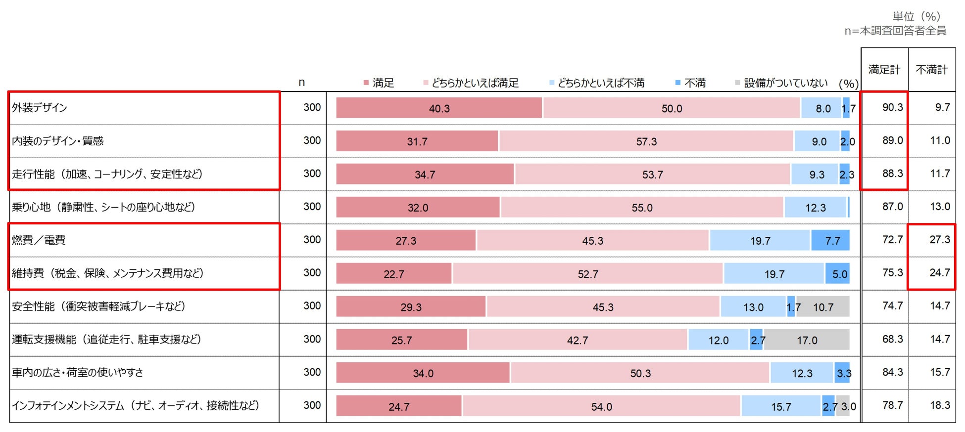 【外装デザイン】【内装デザイン】や【走行性能】などのハードウェア面は「満足計」が約9割と、購入後の評価は良好です。