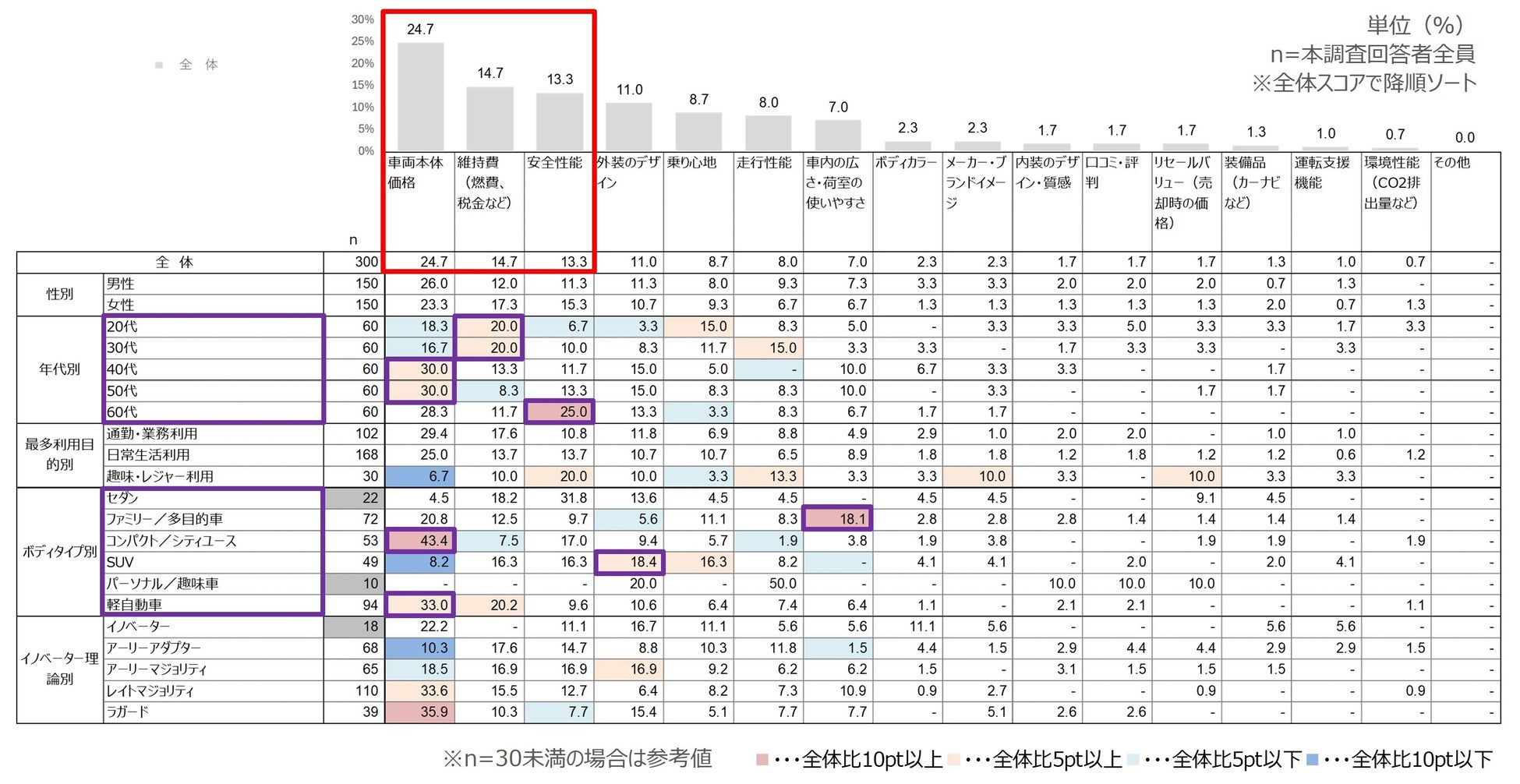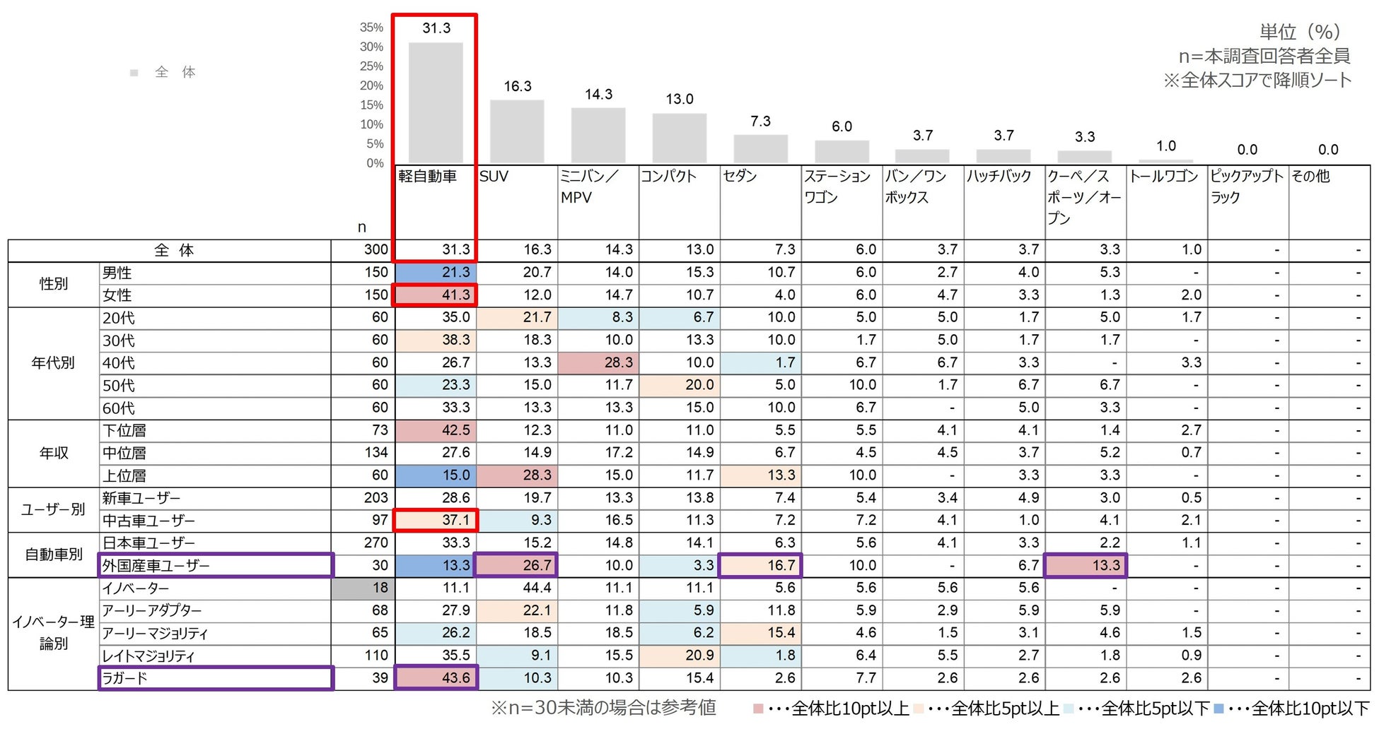 「軽自動車」が約3割とトップで、特に【女性】や【中古車ユーザー】からは4割程度のスコアを獲得しました。