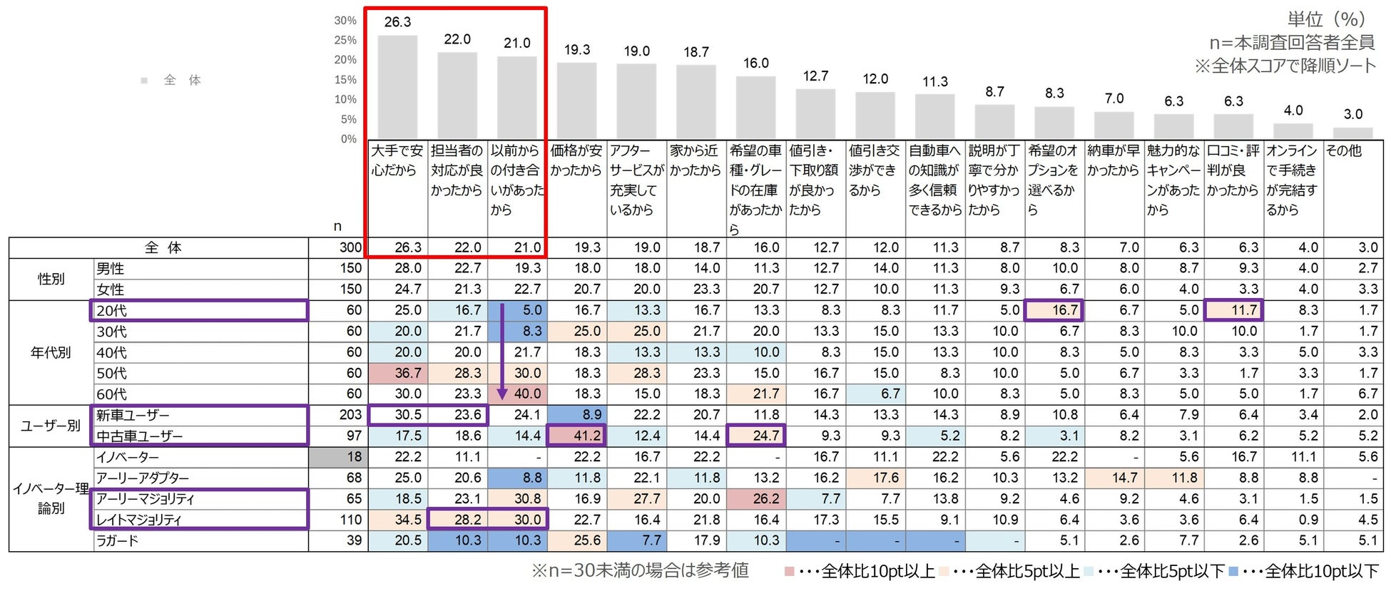 車の購入先を決めた理由の内、「大手で安心」「担当者の対応」「付き合い」といった”関係性・信頼”が上位を占めた