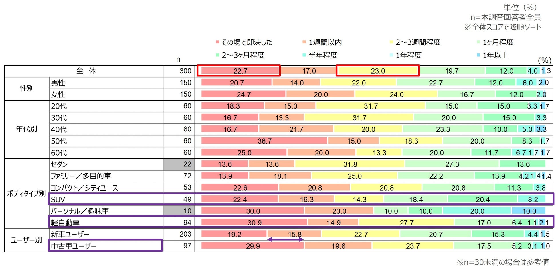 ユーザー別の【中古車ユーザー】は、「即決」の割合が【新車ユーザー】よりも高い。中古車市場は『現品限り』という特性上、理想の1台に出会ったタイミングで即断即決が求められる購買行動が反映されていると考えられます。