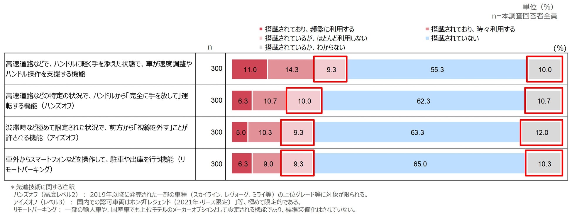 乗っている車の各先進技術の機能搭載認識率は2割~3割半ばと高い数値が出た(しかし、市場の実態より高いため懸念あり)