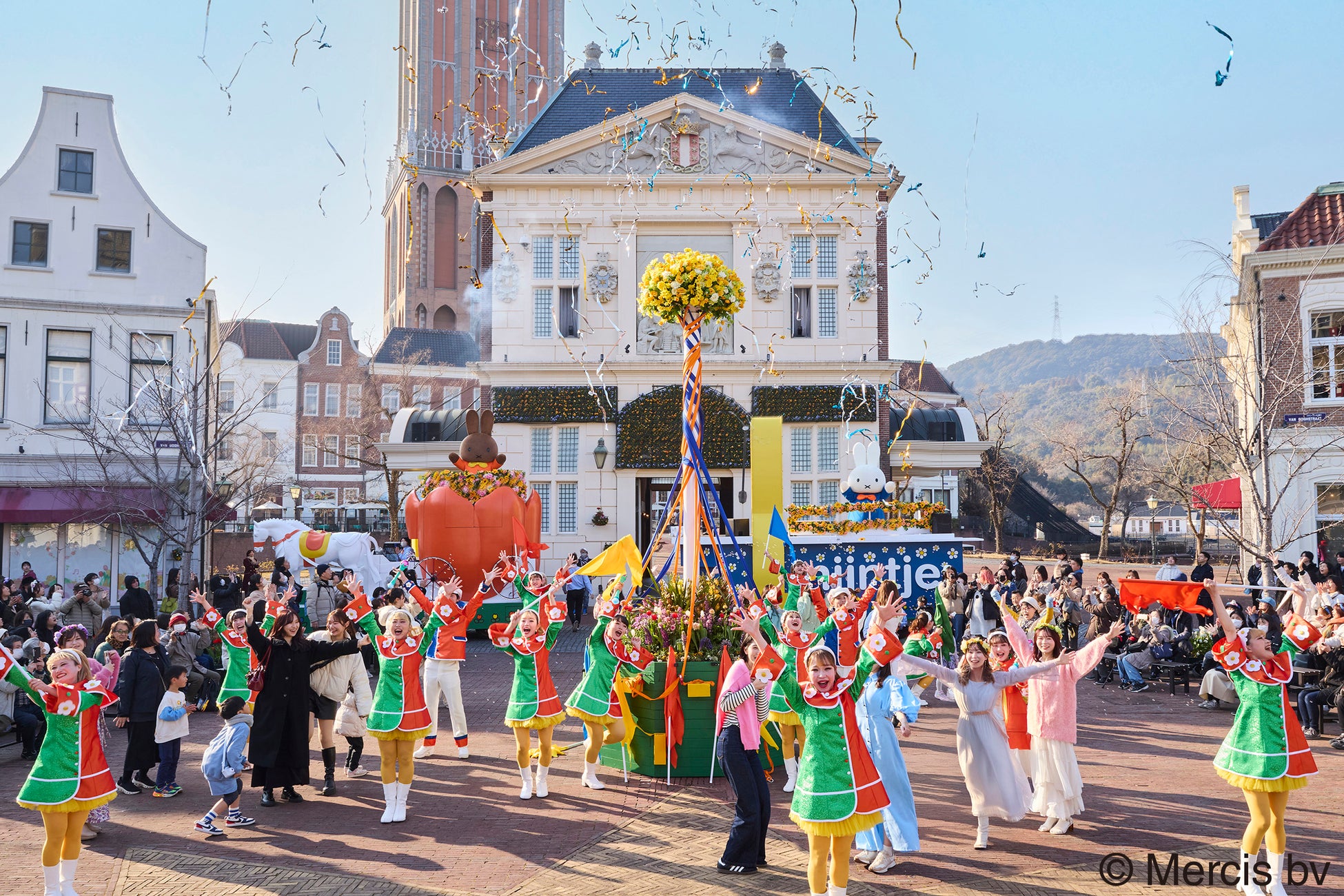 春の柔らかい日差しが包み込むころ、心躍る音楽とともにアトラクションタウンから「ミッフィー・フラワー・パレード」がスタートしました。ミッフィーとお友達のメラニーは、かわいいフロートに乗って登場。花絶景が広がるアムステルダムシティには、今か今かとミッフィーとメラニーの登場を待ちわびる多くのゲストで賑わっていました。待ちに待った、フロートが現れると、花絶景とパレードが相まってゲストたちは「かわいい~」と歓声を上げ、目を輝かせました。嬉しそうに手を振っているゲストや一生懸命写真に収めようとカメラを構えているゲストなど、ミッフィーとメラニーの愛らしい姿に、弾ける笑顔が溢れていました。そして、パレードの新演出として、春の訪れを祝うメイポールダンスなどのダンスタイム(※1)が行われ、ゲストも一緒にリボンを編みながら楽しむ様子が見られました。花絶景に包まれながらパレードに参加したゲストは、心躍り、ワクワクとトキメキを全身で体感していました。