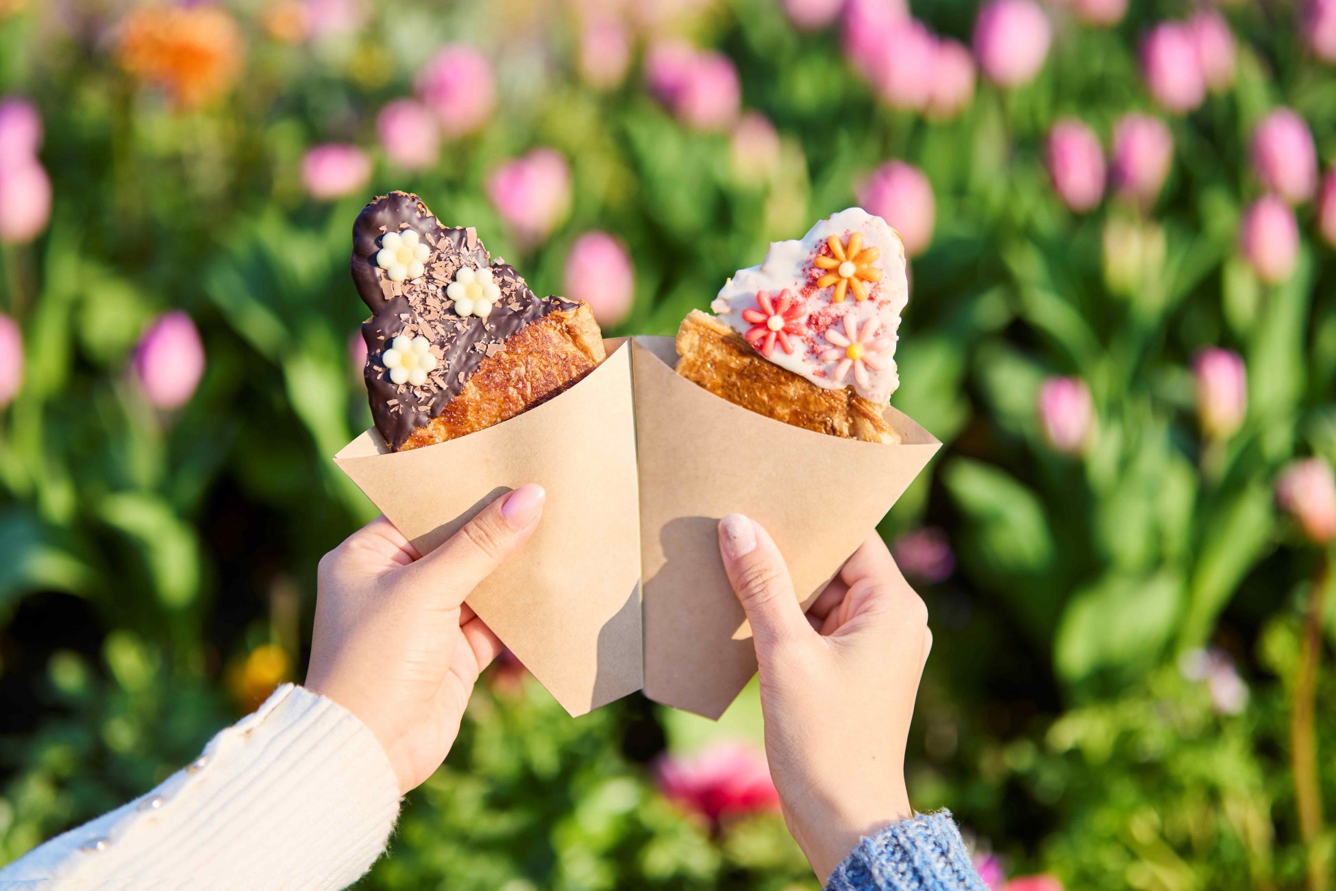 今春、アムステルダムシティの「花の広場」には、花のアーチや花のタワーがそびえ、色彩豊かな花々に180度囲まれる “花絶景”エリアが新たに登場しました。来園したファミリーや友人同士がカメラを手に取り、花々に包まれながら思い思いのポーズで写真を撮る姿が見られました。子どもたちは、華やかに咲き誇る花の広場を満面の笑みで駆け回り、その瞬間を微笑みながらカメラに収める心温まる光景が広がっていました。また、同エリアでワンハンドグルメが楽しめるフードトラックには、クロワッサン生地を薄く伸ばして焼き上げたスイーツ「クルンジ」が新登場。サクサクとした食感とバターの豊かな風味が特徴で、かわいくて写真映えするワンハンドグルメを手に、ゲストは楽しさ溢れるひと時を満喫していました。