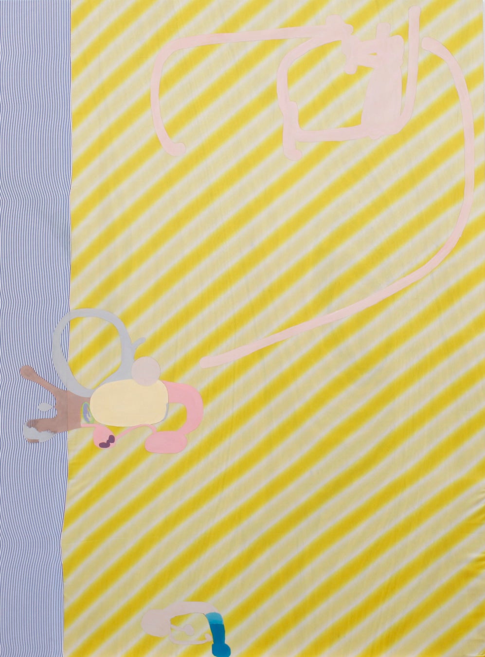 この作品は ストライプの布をパネルに張った時、布の薄さからパネルの木目が透けて、それを眺めていると模様の前後がわからなくなる心地悪さから描き始めました。布だけだと気取っただまし絵みたいで少し気に入らなかったので 情けない線を上から描きました。