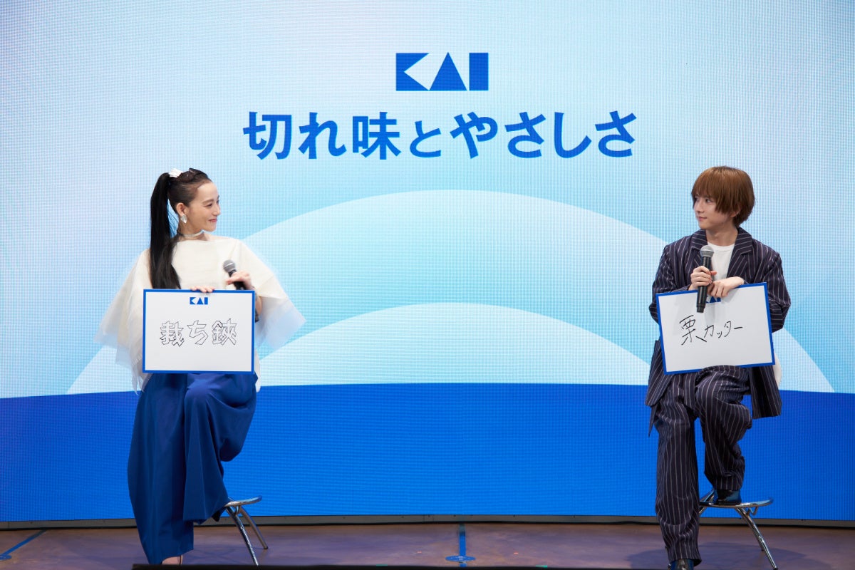 イベントでは、貝印社長の遠藤浩彰から、未来に向けたさまざまな取り組みを紹介。続いてのトークセッションでは、AUGERブランドアンバサダーであり、俳優活動だけにとどまらず、自らも初個展を成功させ、芸術にも精通している板垣李光人さんと、デザイナー、アーティストとして活躍する篠原ともえさんをスペシャルゲストにお迎えして、貝印のミッションである「切れ味とやさしさ」に関連したエピソードをお話しいただきました。今回は特別に篠原さんが「切れ味とやさしさ」をテーマに貝印のラシャ鋏を使ってオリジナルの衣装を制作。当日は、生地のレイヤーや素材を生かして刃物の切れ味や光沢を表現し、衣装を着用して登壇くださいました。