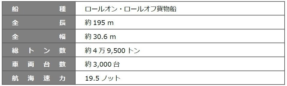 長さ約195m、幅約30.6m、総トン数約4万9,500トンの本船は、乗用車約3,000台の積載能力を有しています。主機関および主発電機関には、LNGと軽油それぞれを燃料として使用できる高性能デュアルフューエルエンジンを搭載し、同じ船型で重油を使用した場合と比較して、CO2排出量を25%削減、SOx(硫黄酸化物)排出量がほぼゼロという優れた性能を達成しており、環境負荷の低減に寄与します。