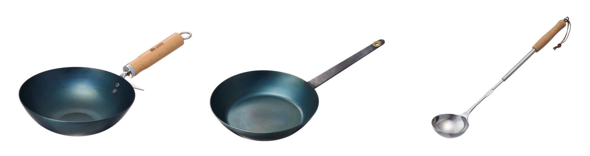中華鍋とフライパンには、鉄板を丹念にヘラで絞って形成する日本製のへラ絞り加工を採用し、優れた蓄熱性と軽量化の両立を実現。ハードテンパー加工を表面に施しているのでシーズニング不要。お玉はステンレス製なので耐熱性や耐久性に優れる。