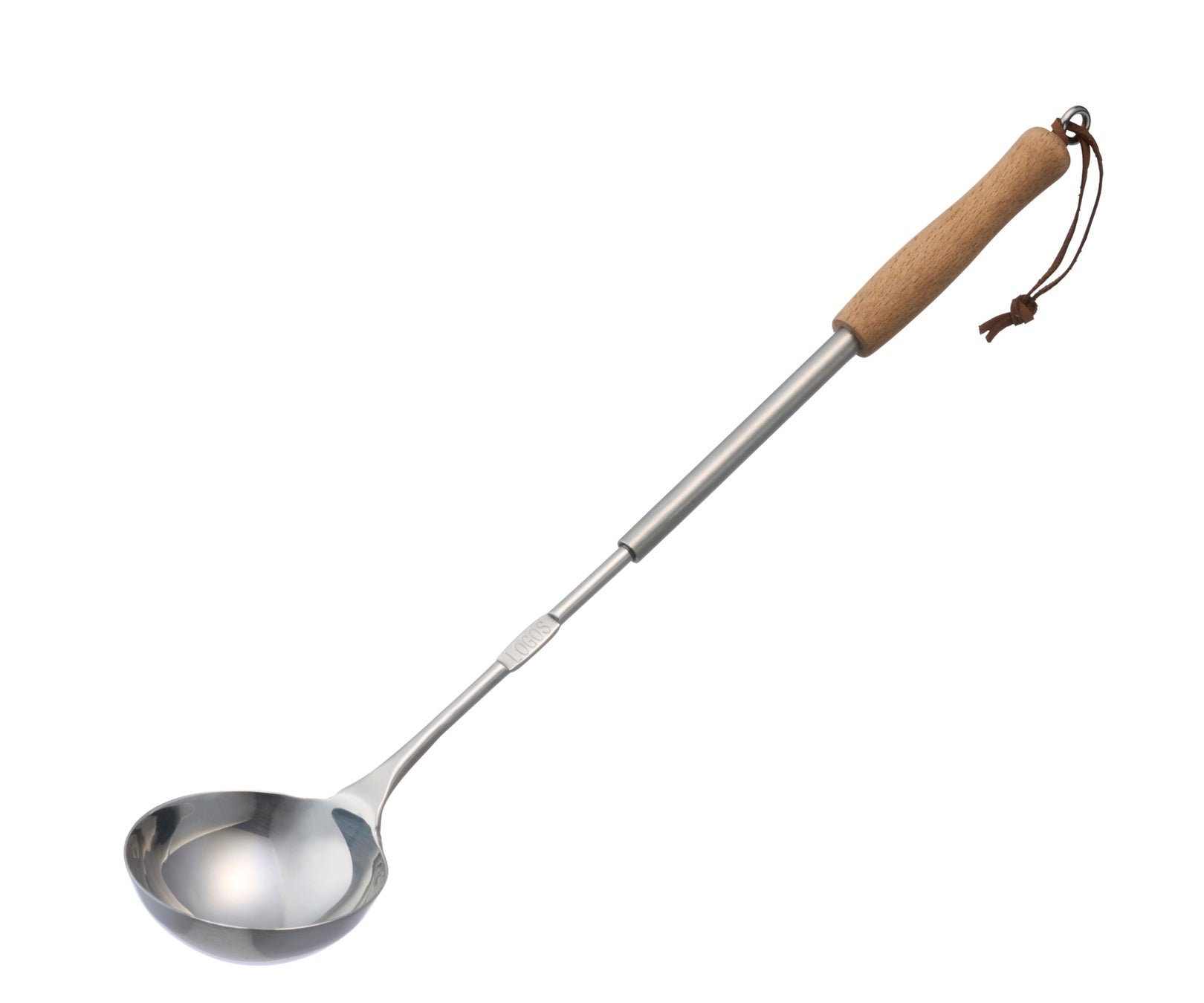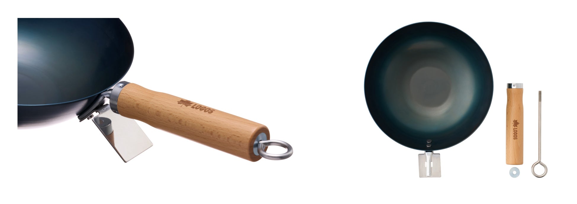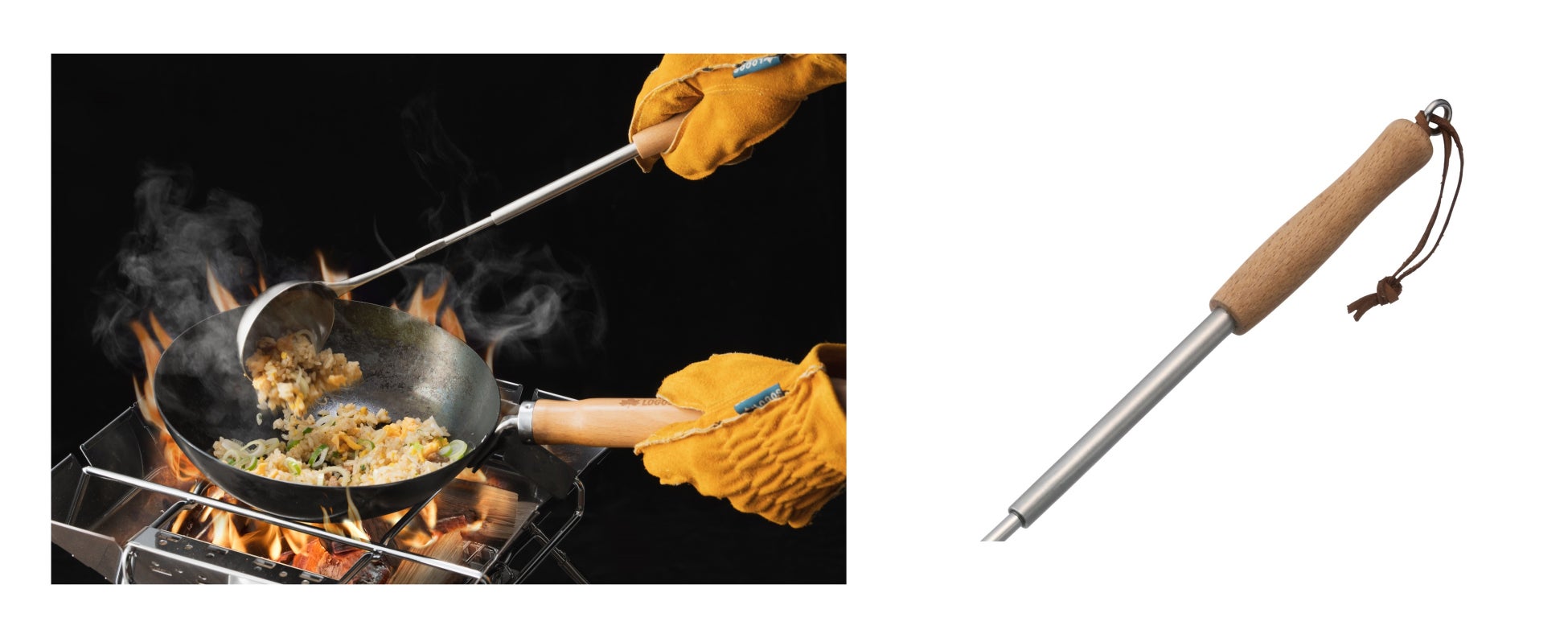 持ち手が全長40cmと長めの仕様。手が火元から離れるので火力が強い中華料理にも最適。「LOGOS 鉄の職人中華鍋」とセットで使用すればアウトドアでも本格的な調理ができる。握りやすく熱が伝わりにくい木製の持ち手を採用。